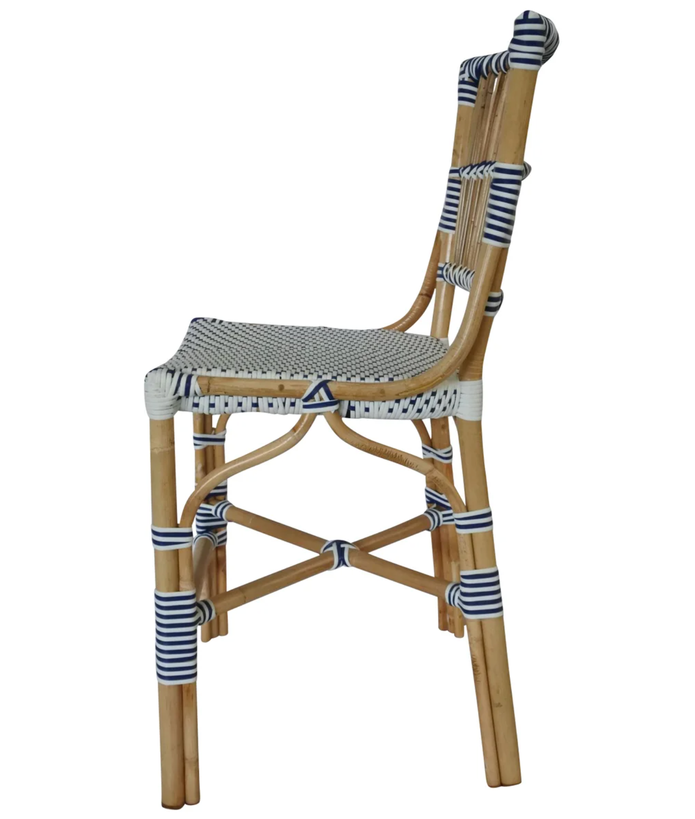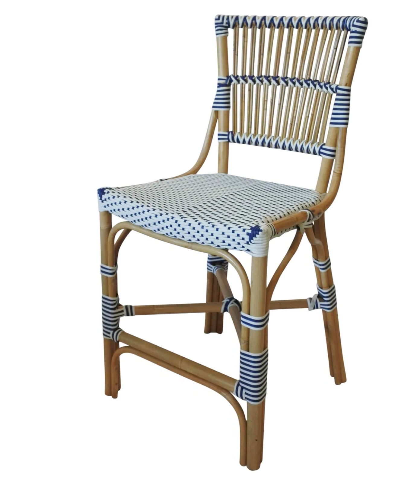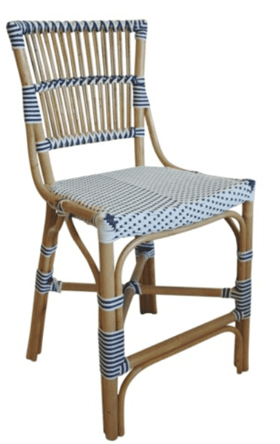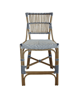A newer modern twist on the classic European Bistro Chair. The Marbella has been re-sized and styled with authentic pole rattan frame is wrapped with woven white weave with navy blue highlights now featured on both the seat and the back.. We find this color combination to be perfect for the coastal kitchen. The stool is perfect along the kitchen island or bar to bring together family and friends in any coastal kitchen.