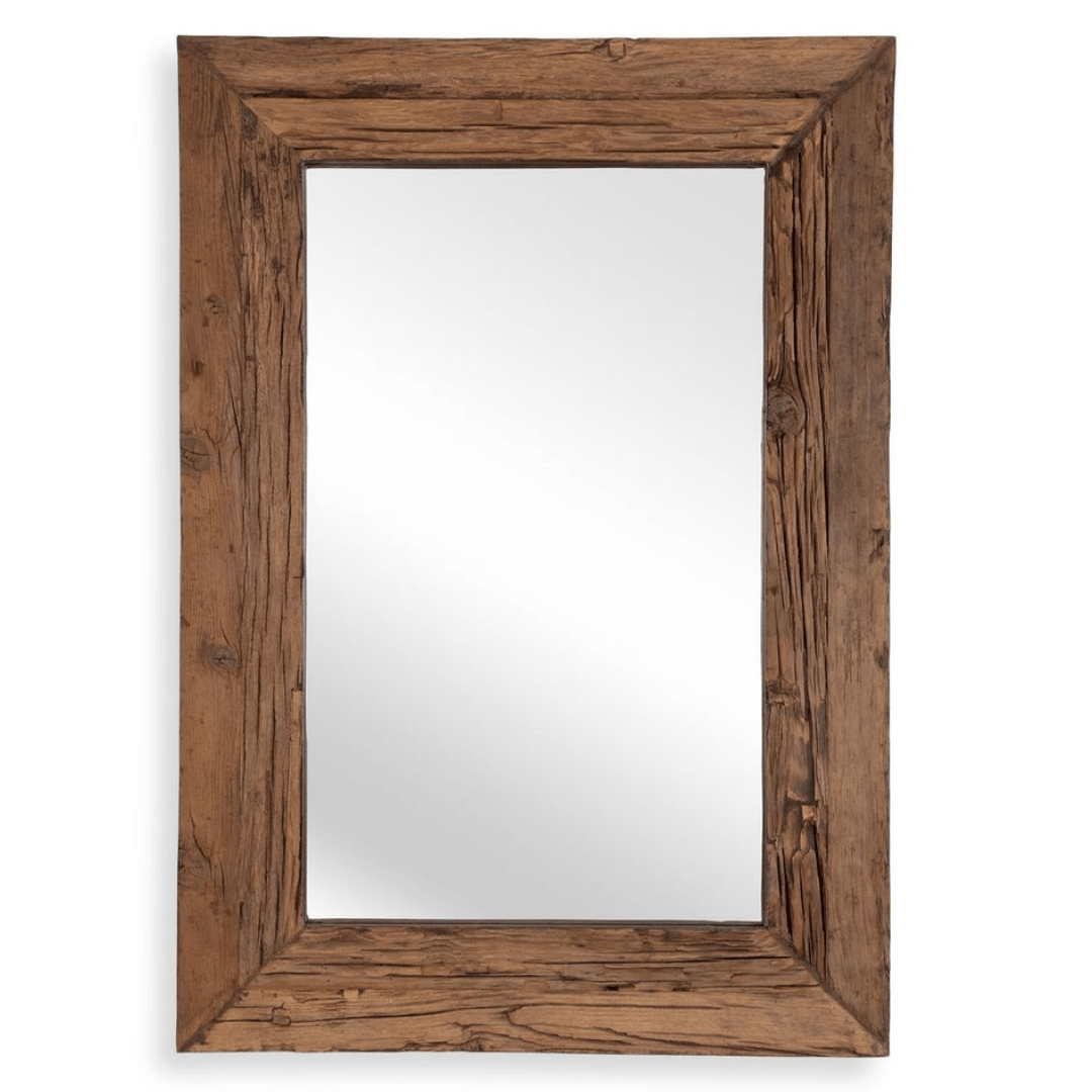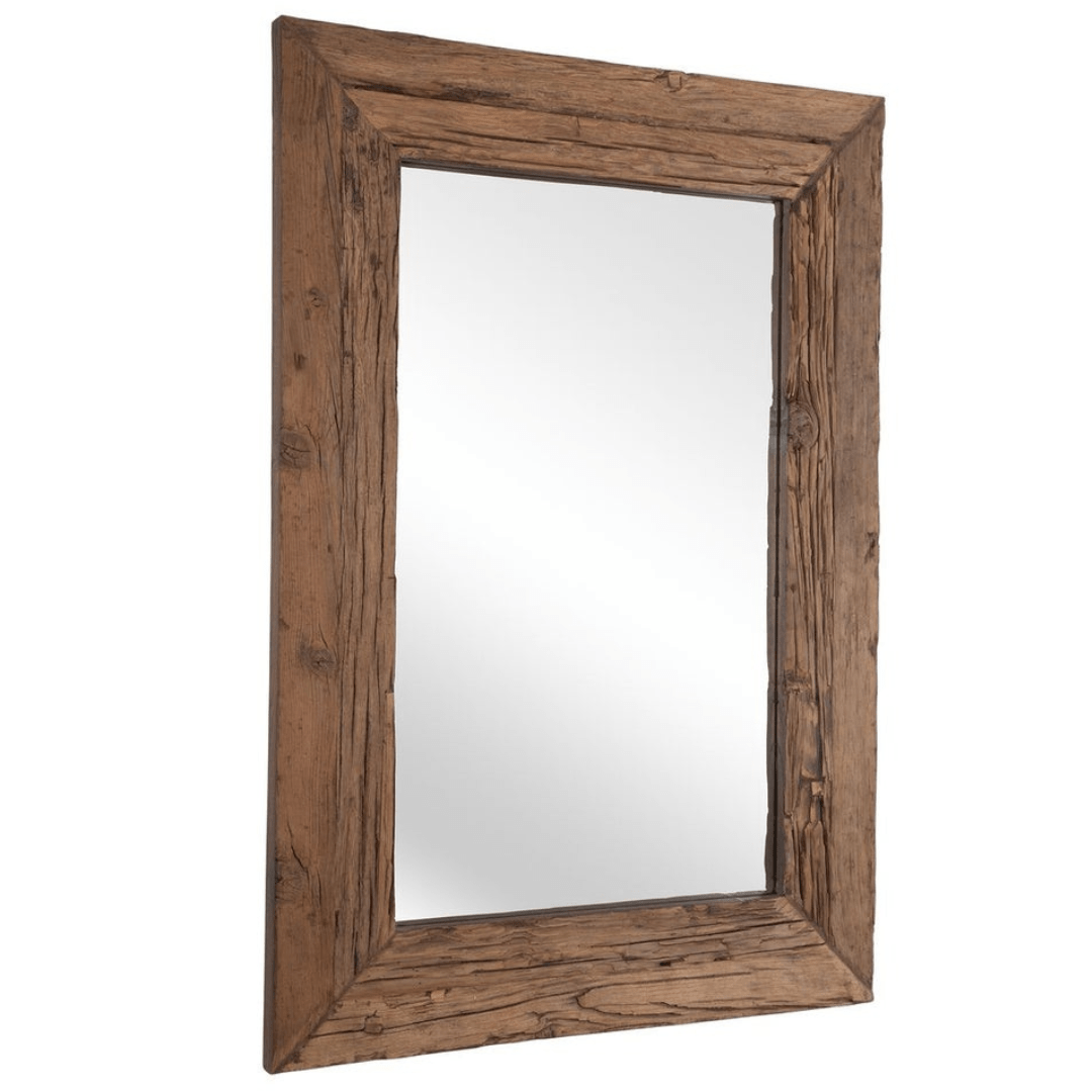 The Maldives large mirror features a reclaimed, rustic pine wood frame with naturally weathered knots and imperfections. True to salvaged material, each pine will have slight variations. Solid wood will continue to move with temperature and humidity changes, which can result in small cracks and uneven surfaces, adding to its authenticity and character.