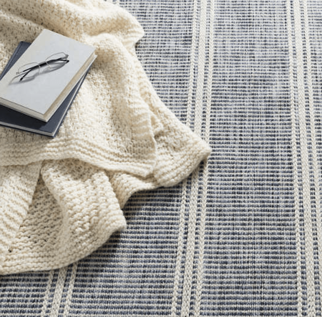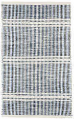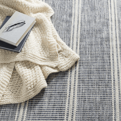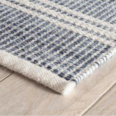 Coastal chic and yet dreamy. The faded mini stripes whisper of faded blue behind a herringbone relief cream spacers like the sound of the distant surf. Add a beach-y feel with this weathered effect, durable, lightweight, wool flat weave rug.