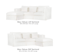 Enjoy this ultra comfortable and clean lined, simply tailored Maui Deluxe Slipcovered Sectional from our Island Collection. The Maui features sloped arms, deep seating and an abundance of luxurious accent pillows. Choose from a RAF (Right Arm Facing) Chaise Lounge or an LAF (Left Arm Facing) Chaise with a One Arm Sofa, whichever fits your space better. The Maui Sectional is the ideal piece for unwinding, lounging and relaxing.