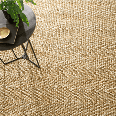 Chunky, ropey weave of thickly twisted undyed jute packs color and texture variations into an oversize tweedy herringbone. Traditional in Celtic wool tweeds, Roman highways, North American Indian basketry, Ancient Egyptian textiles, the chevron is a motif that unites us through the ages and is never out of style.