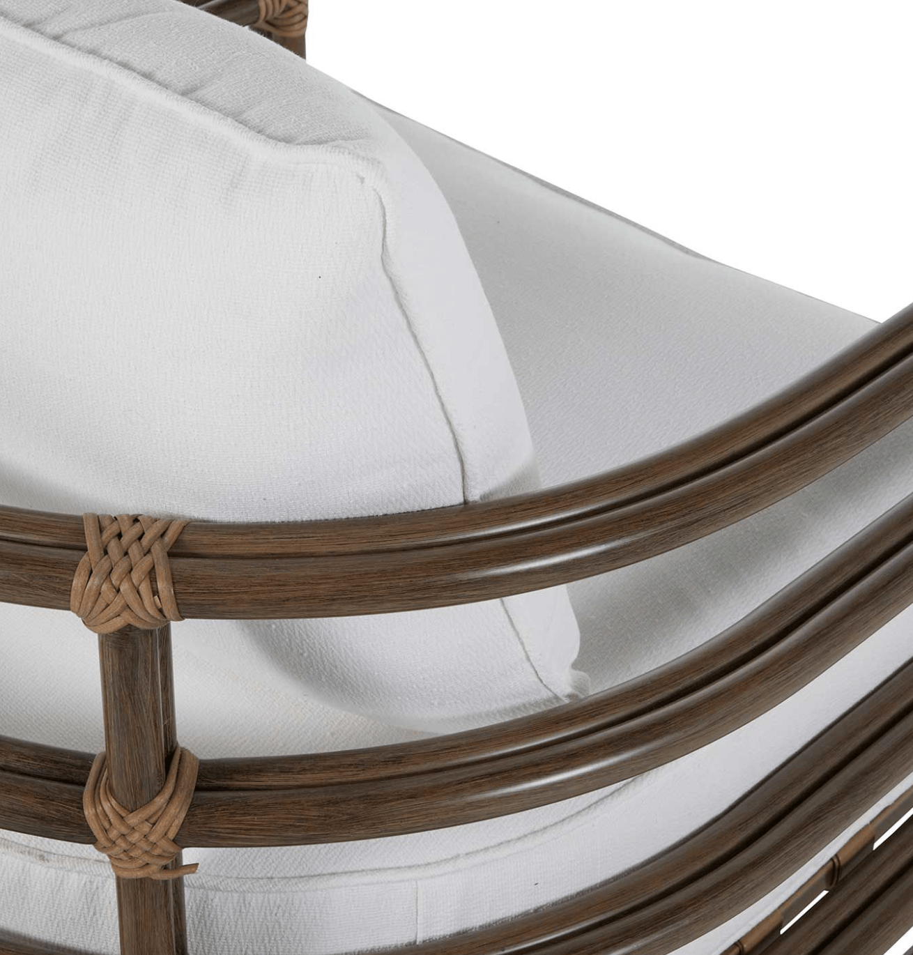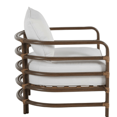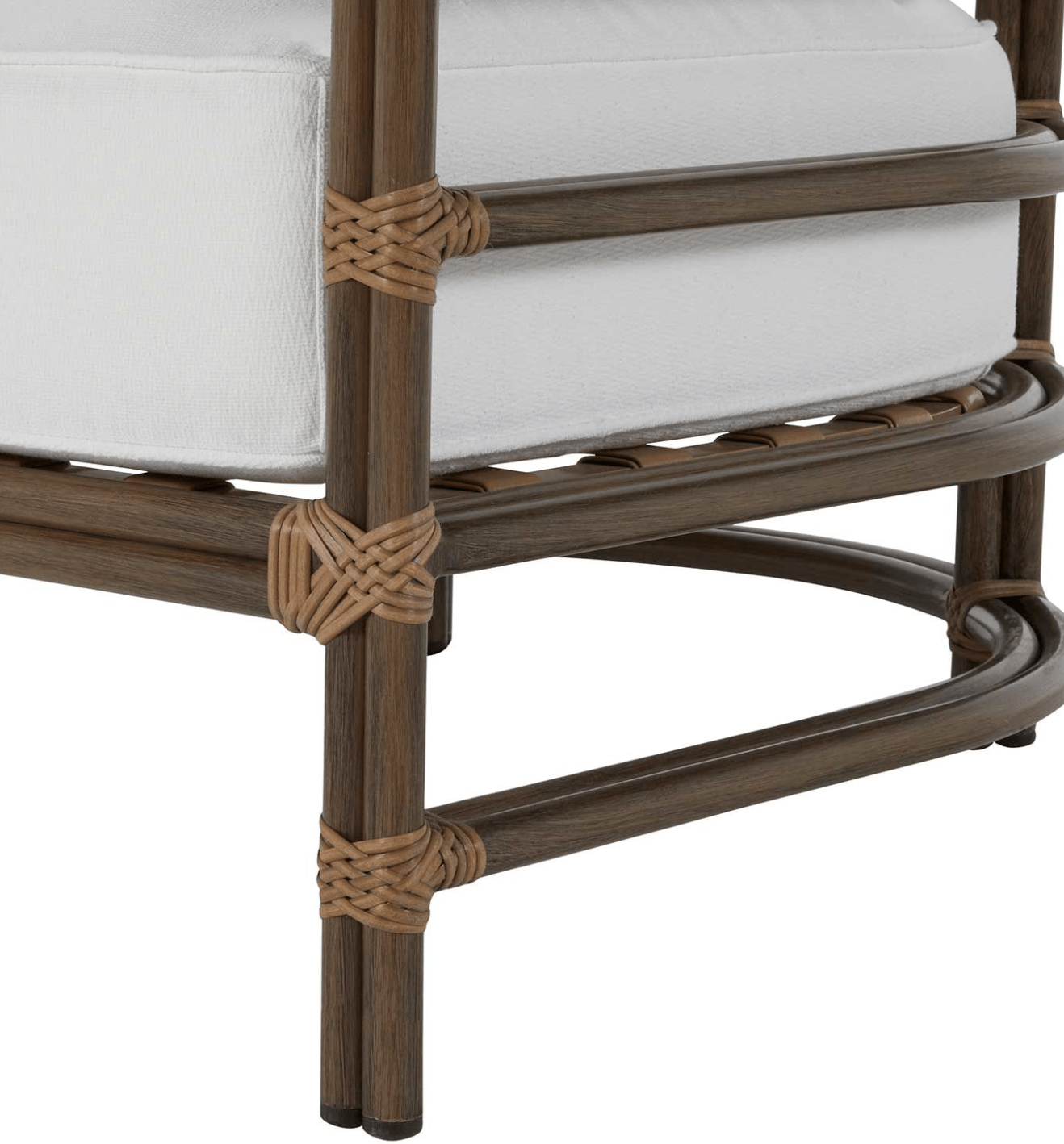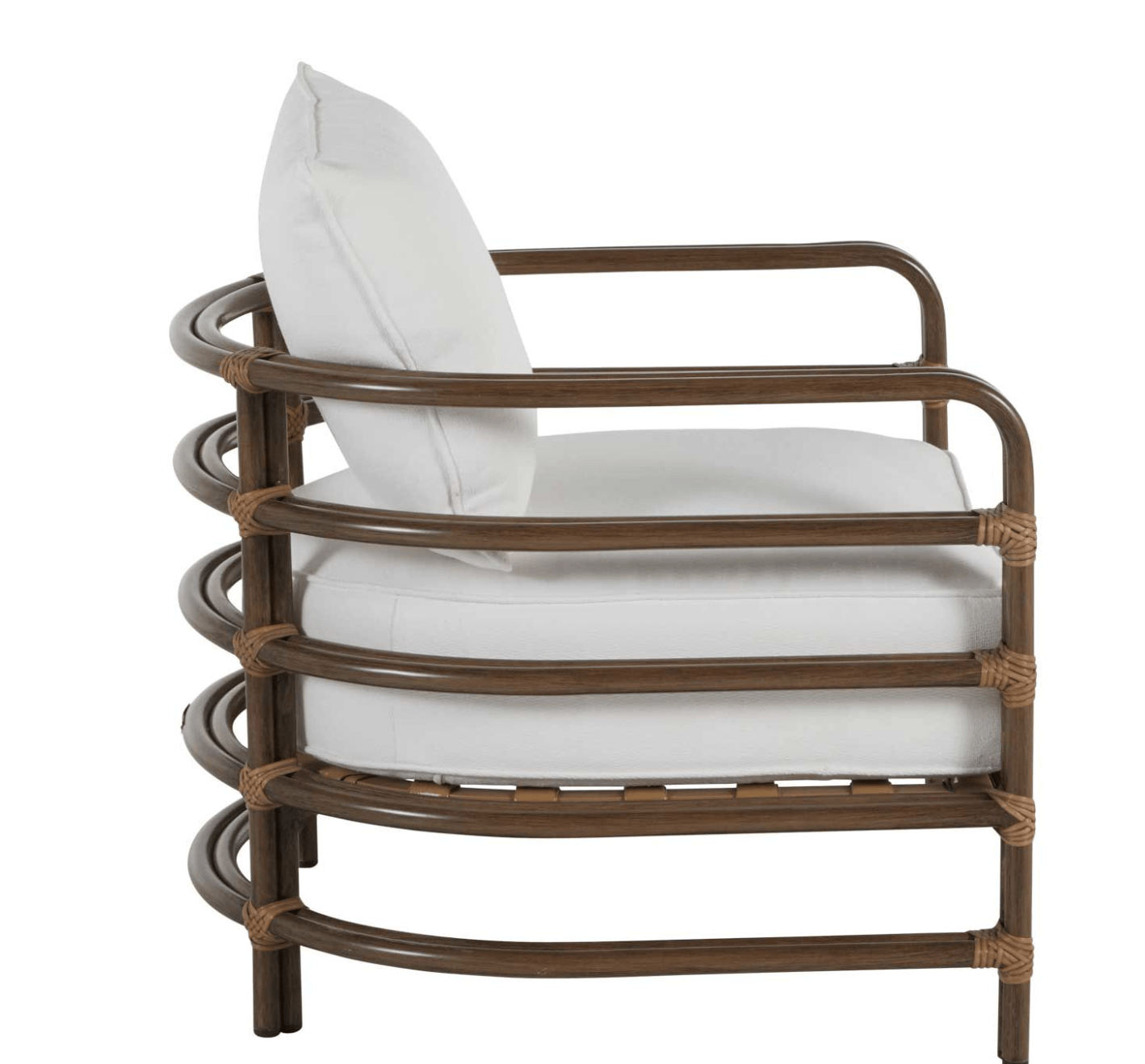 Inspired by the vintage look of natural rattan, the Monaco Outdoor Collection mixes materials for a modern, minimalist take on outdoor furniture. The Barrel Chair is crafted with premium wrought aluminum paired with N-dura™ resin wrapping, which creates a dramatic interplay between the oak and burlap finishes. Vintage meets modern technology to ensure longevity and beauty with little to no maintenance.