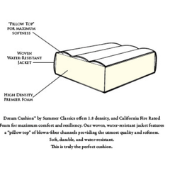 Cushion Details: Premium Cushion Made in the USA. It offers 1.8 density high resilient and California Fire Rated Foam for maximum comfort. For outdoor endurance, each cushion is wrapped in a woven, water-resistant jacket. The woven, water-resistant jacket features a “pillow top” of blown-fiber channels to provide the utmost quality and softness. Combined with the water-resistant properties of the outdoor fabrics, this means that neither rain nor wet swimsuits will soak your cushions. This also means that mold and mildew won’t find their way into your investment.