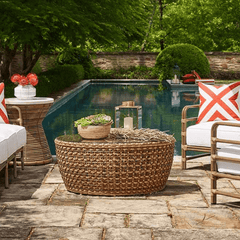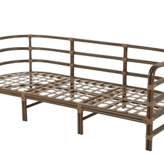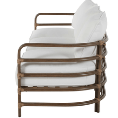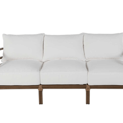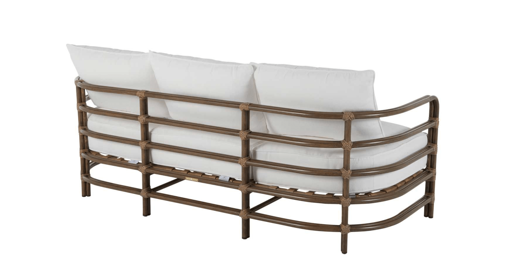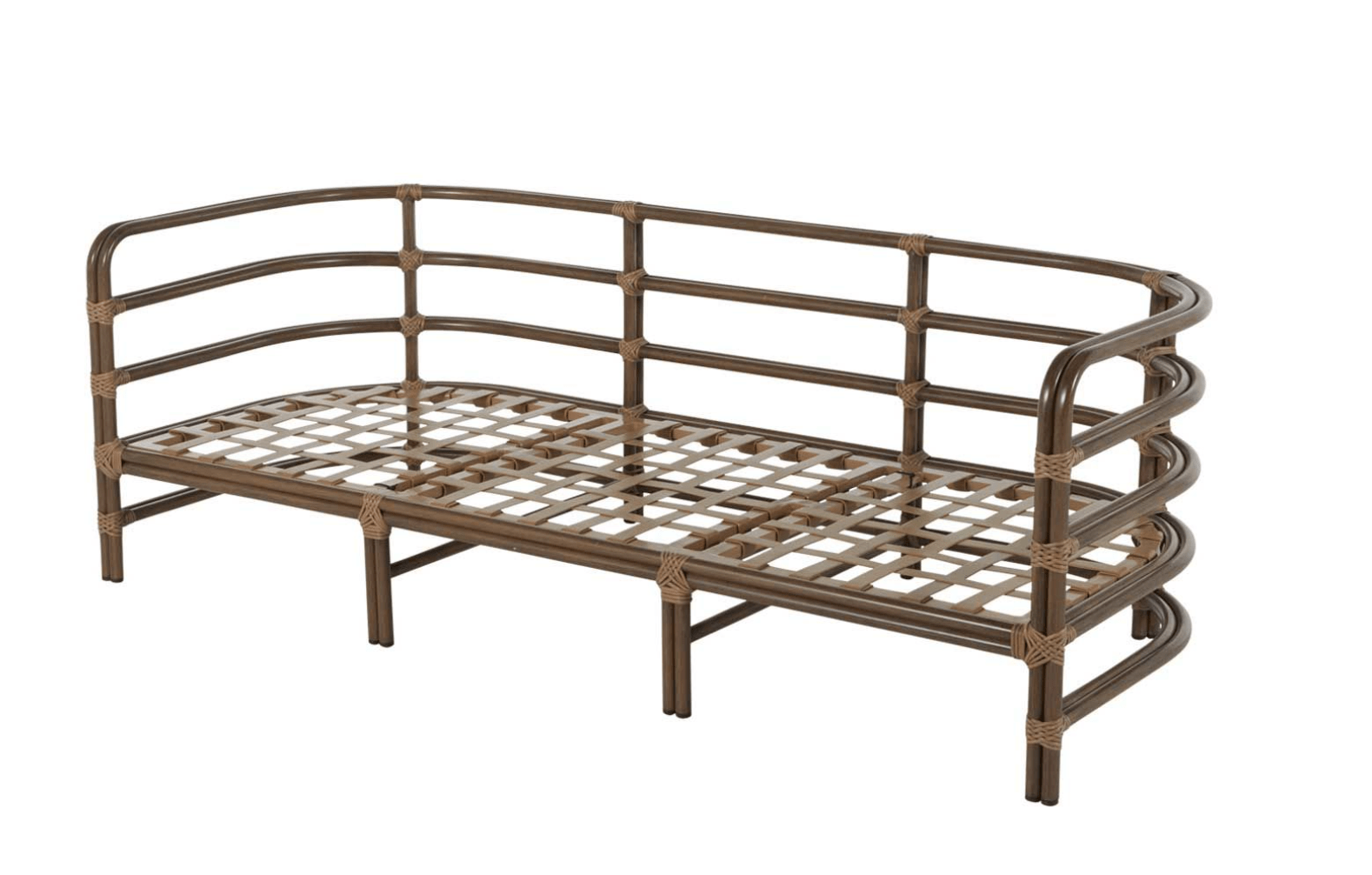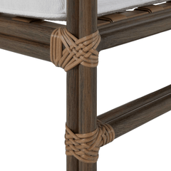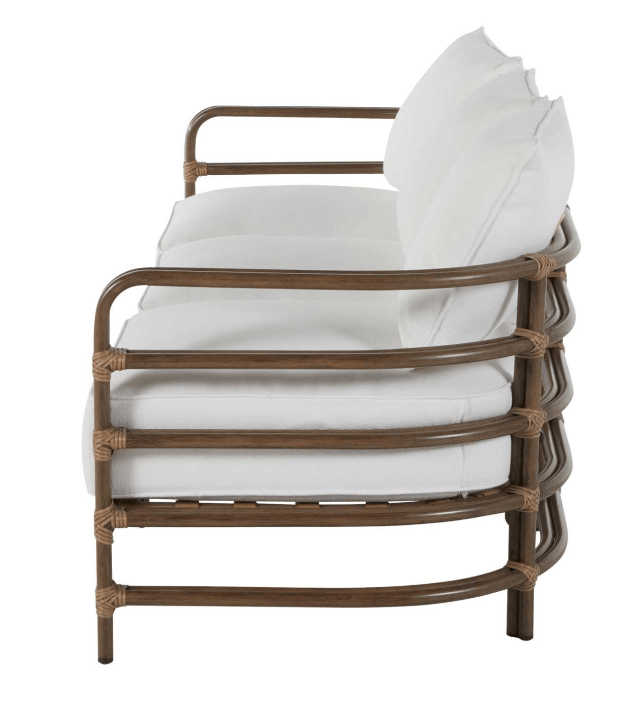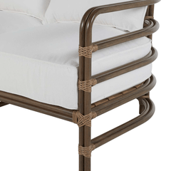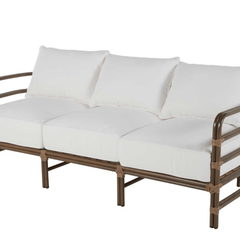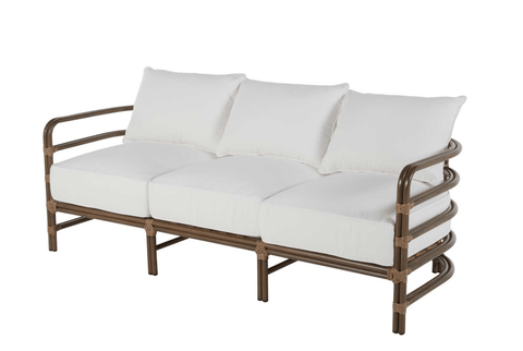 Inspired by the vintage look of natural rattan, the Monaco Outdoor Collection mixes materials for a modern, minimalist take on outdoor furniture. The Monaco Sofa is crafted with premium wrought aluminum paired with N-dura™ resin wrapping, which creates a dramatic interplay between the oak and burlap finishes. Vintage meets modern technology to ensure longevity and beauty with little to no maintenance.