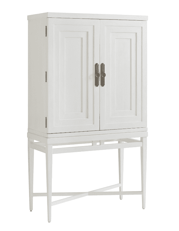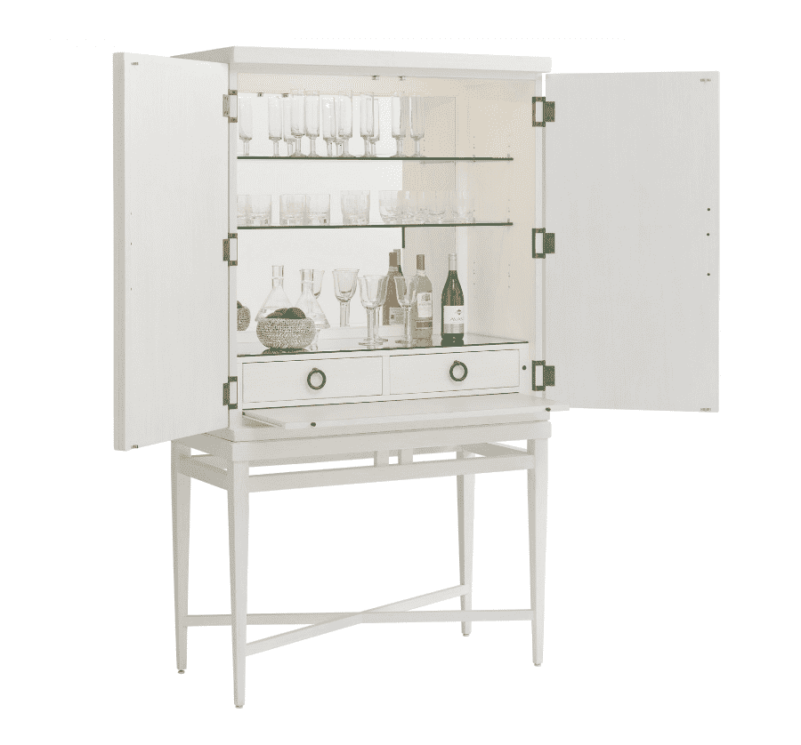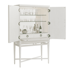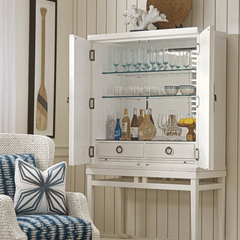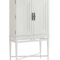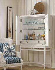 The Monterey Sands bar cabinet is the perfect accent piece off the living area or in the dining room. This luxurious cabinet blends form and function with step-down molding design on the doors as well as an architectural base. Behind the doors are three adjustable glass shelves, two storage drawers and a handy pull-out serving shelf.