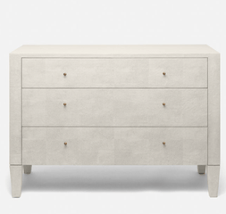 Materials define our classic look of the Moonstone Bay Petite Dresser. The piece is fully wrapped in faux shagreen with fine, subtle brass hardware and finished with bottom mount soft glides on each drawer. Plentiful drawers inset into the frame for a flush profile and in a petite size for a scaled down bedroom.