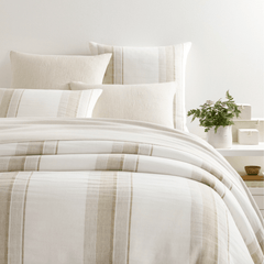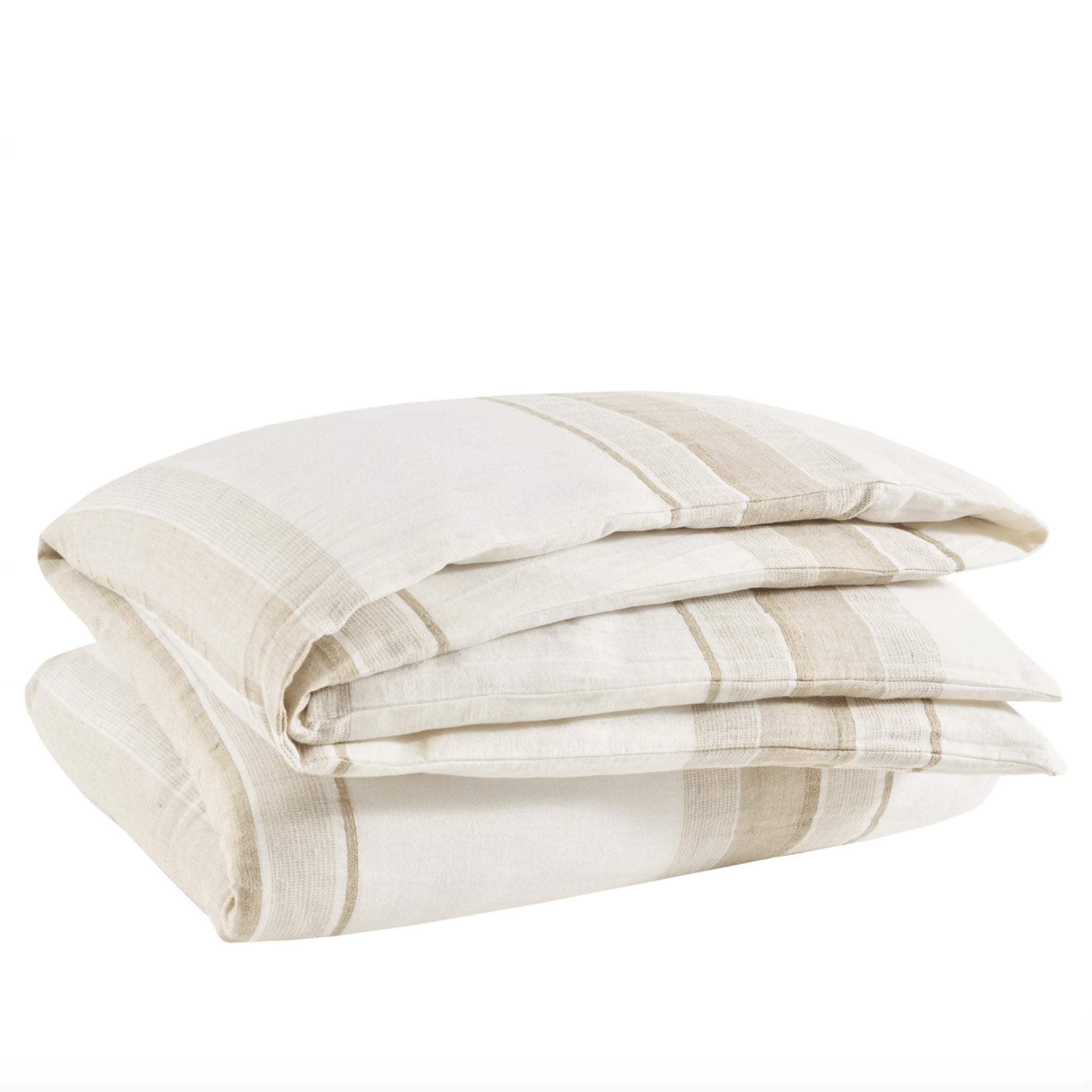 Horizontal stripes in shades of natural and ivory on a lightweight linen/cotton blend gives this duvet a timeless, classic appeal. We love that it features a hidden button closure and corner ties to keep it securely in place.