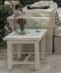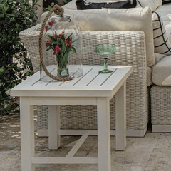 The Narragansett Side Table is crafted from premium wrought aluminum for stability and durability, this square side table features a traditional slatted top with a powder-coated finish that is ten times thicker than wet-coat paint for years of enjoyment.