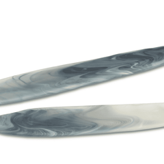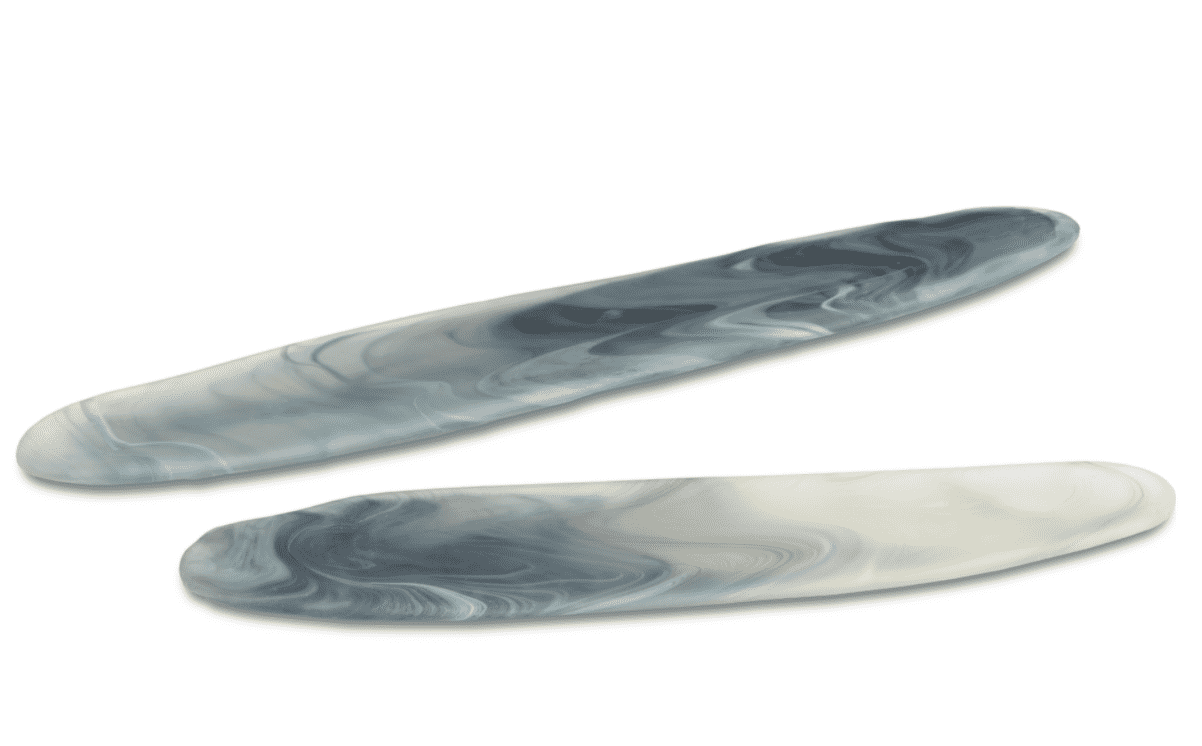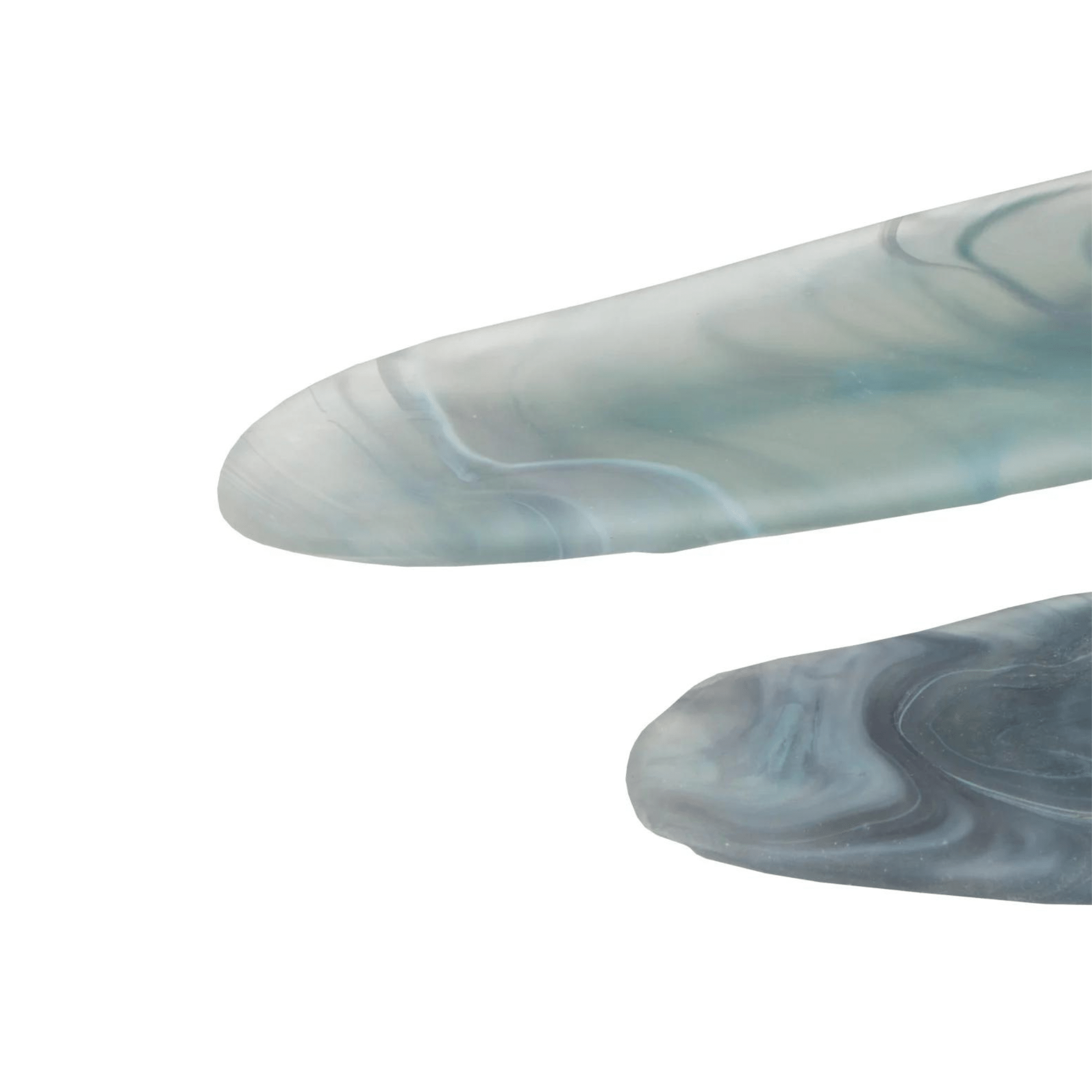 The Ocean Glass Midnight Blue Tray Set consists of two handmade oblong decorative trays created by a glass artist using a very sophisticated mix of white glass and dark blue glass. By swirling the two, the artisan created an effect of billowing ocean waves on these glass trays. Use them as elegant desk trays or, if friends are showing up, to hold canapes or finger sandwiches.