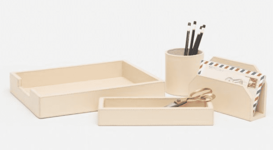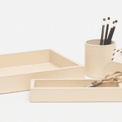 Keep your home office and desk top organized with the Orsett Accessory Set. Light, bright, and luxurious cream leather pieces consist of: pencil cup, glasses/scissor tray, letter tray and memo holder.
