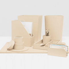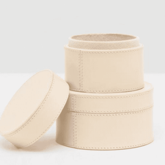 Keep your home office and desk top organized with the Orsett Box Set. Light, bright, and luxurious cream leather round boxes store binder clips, paper clips, notes and more. Works beautifully with the Orsett Desk Blotter Set and other accessories.