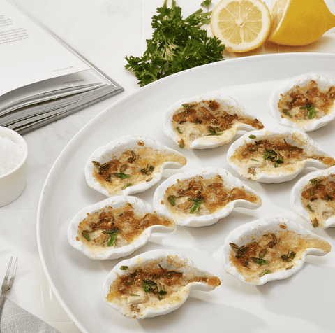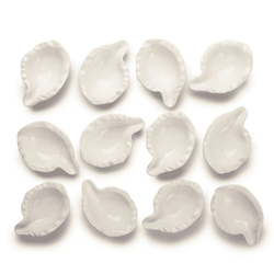 Dress up your dinner party by serving oysters Rockefeller or any side dish on this set of 12 Ceramic oyster plates.