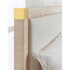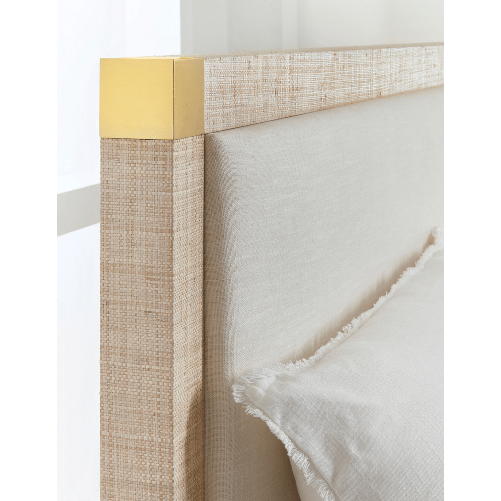 Blending natural texture with refined design, this raffia-papered bed brings effortless sophistication to any bedroom. The linen-upholstered headboard on the Palma Bed offers a soft, inviting touch, while gold-accented corners add a hint of luxury. With its clean lines and neutral tones, this bed creates a serene and stylish retreat, perfect for modern coastal or transitional spaces.