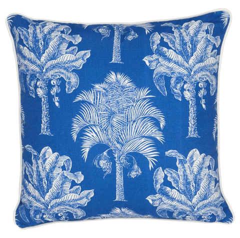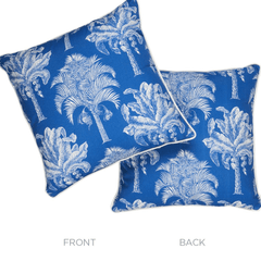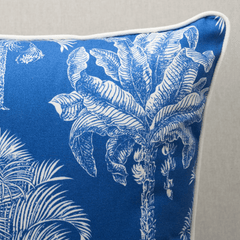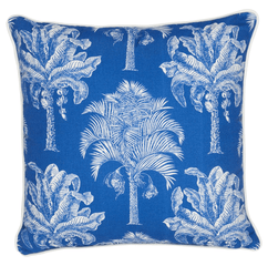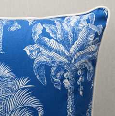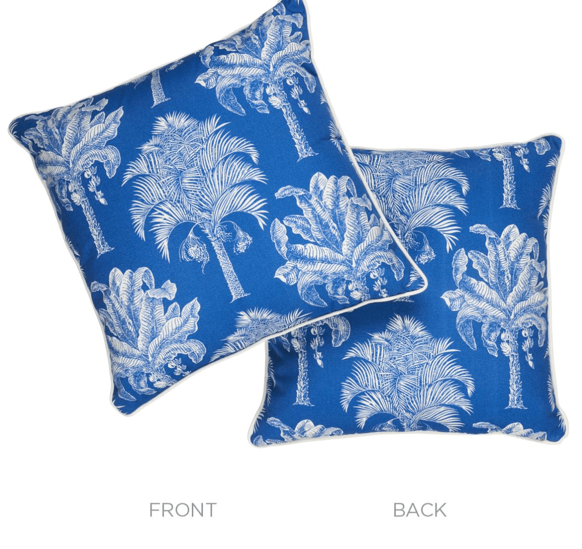 This pillow features Grand Palms Pacific Blue fabric. Featuring fabulous palm trees scaled to fit beautifully on pillows, Grand Palms is a wonderfully versatile design with tropical flair. Pillow is finished with a welt in Eubie Lip Cord.
