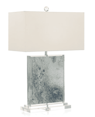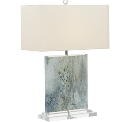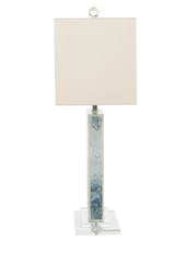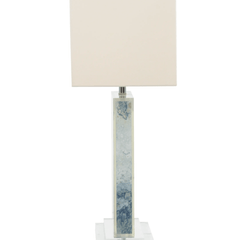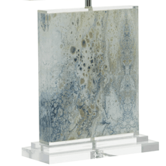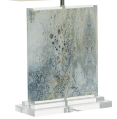 This stunning table lamp features a natural, organic design on fine fabric that has been encapsulated in a clear composition. The crisp white linen shade is the perfect topper for the colors in the body.