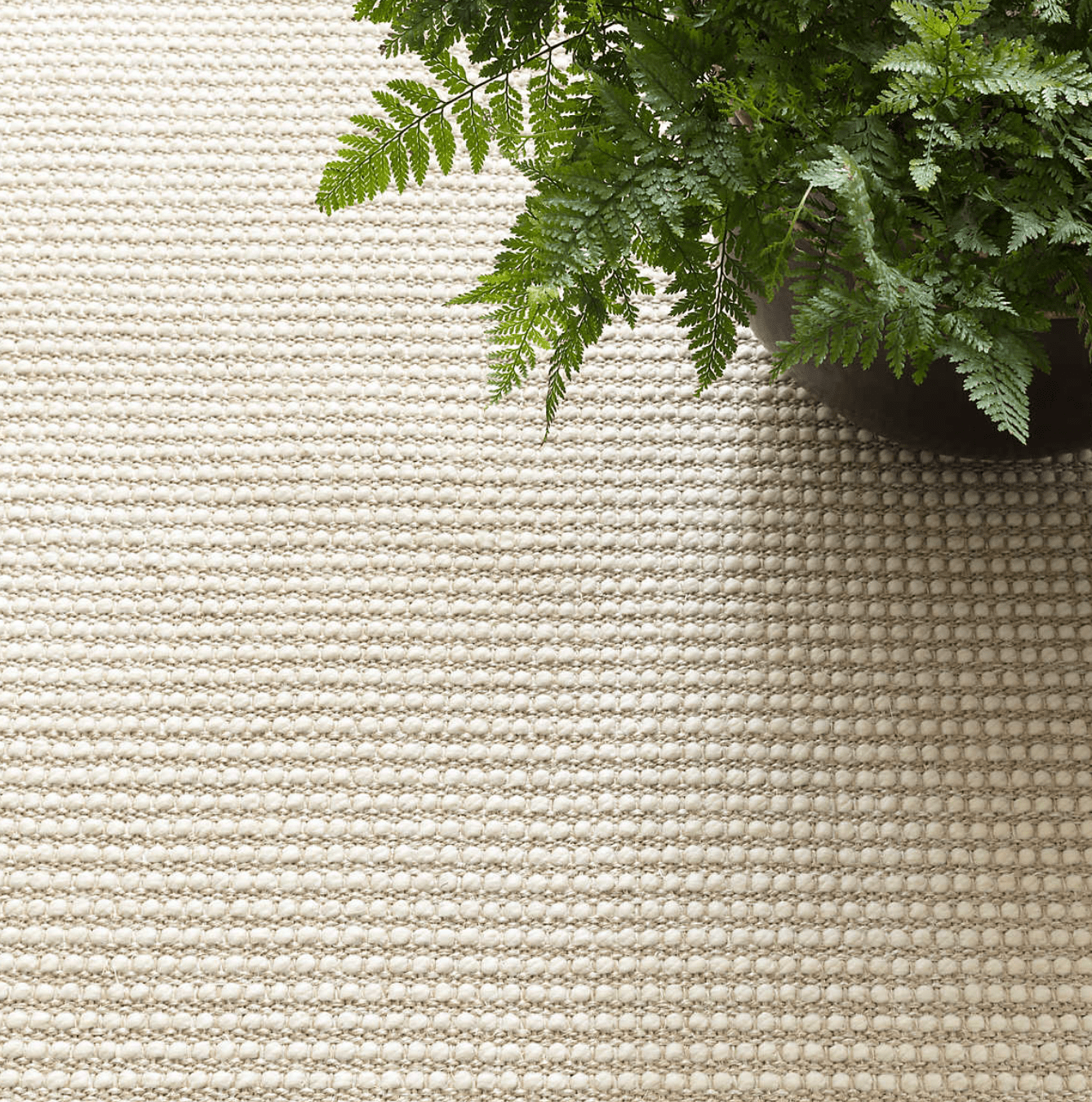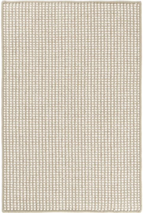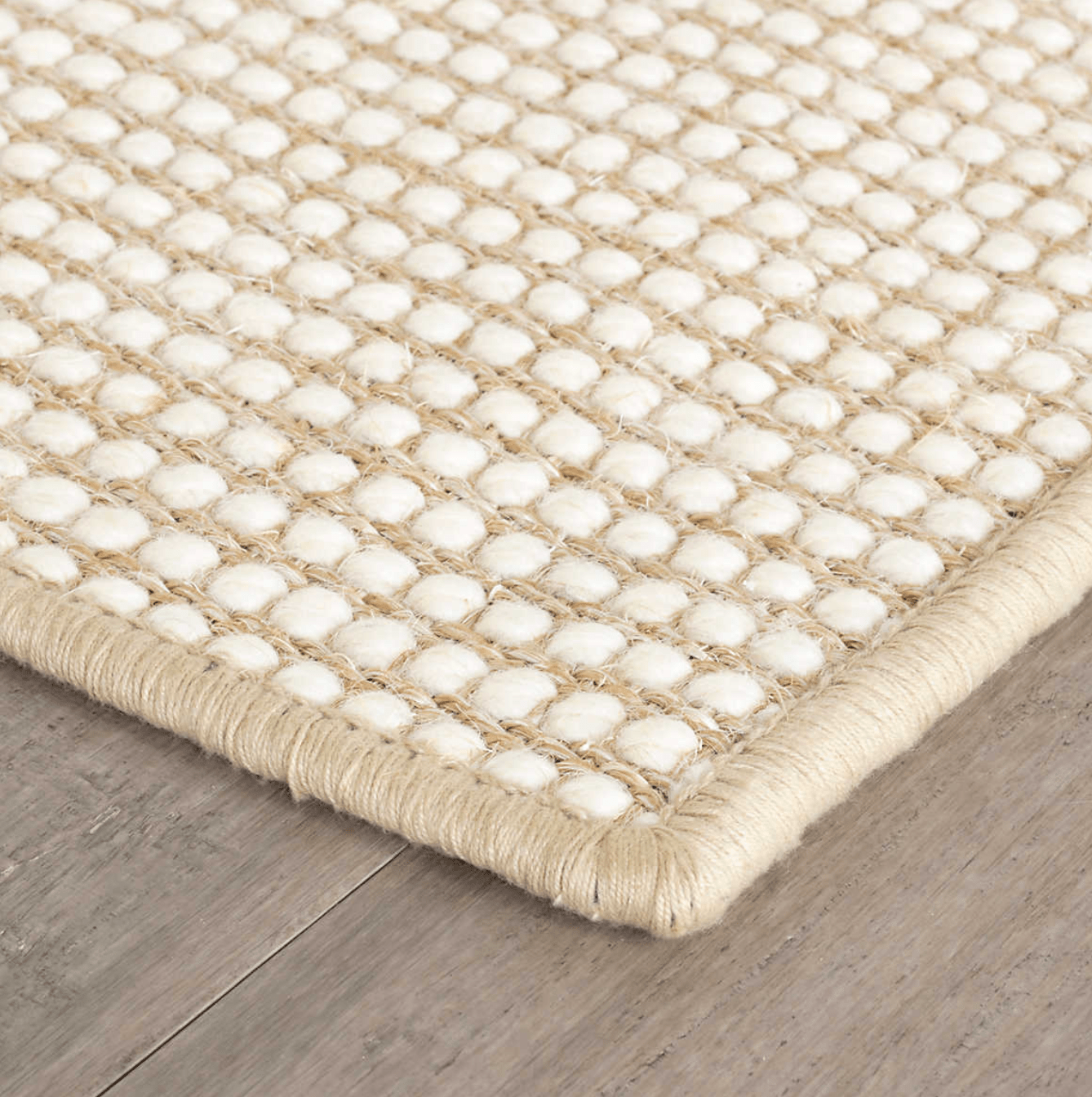 Mini popcorn in soft and warm ivory wool roving runs across a rustic jute base in classic tan. Comforting and cozy, yet durable and low profile it can grace any room with natural, understated style.