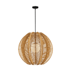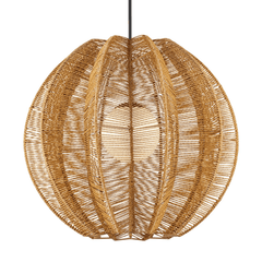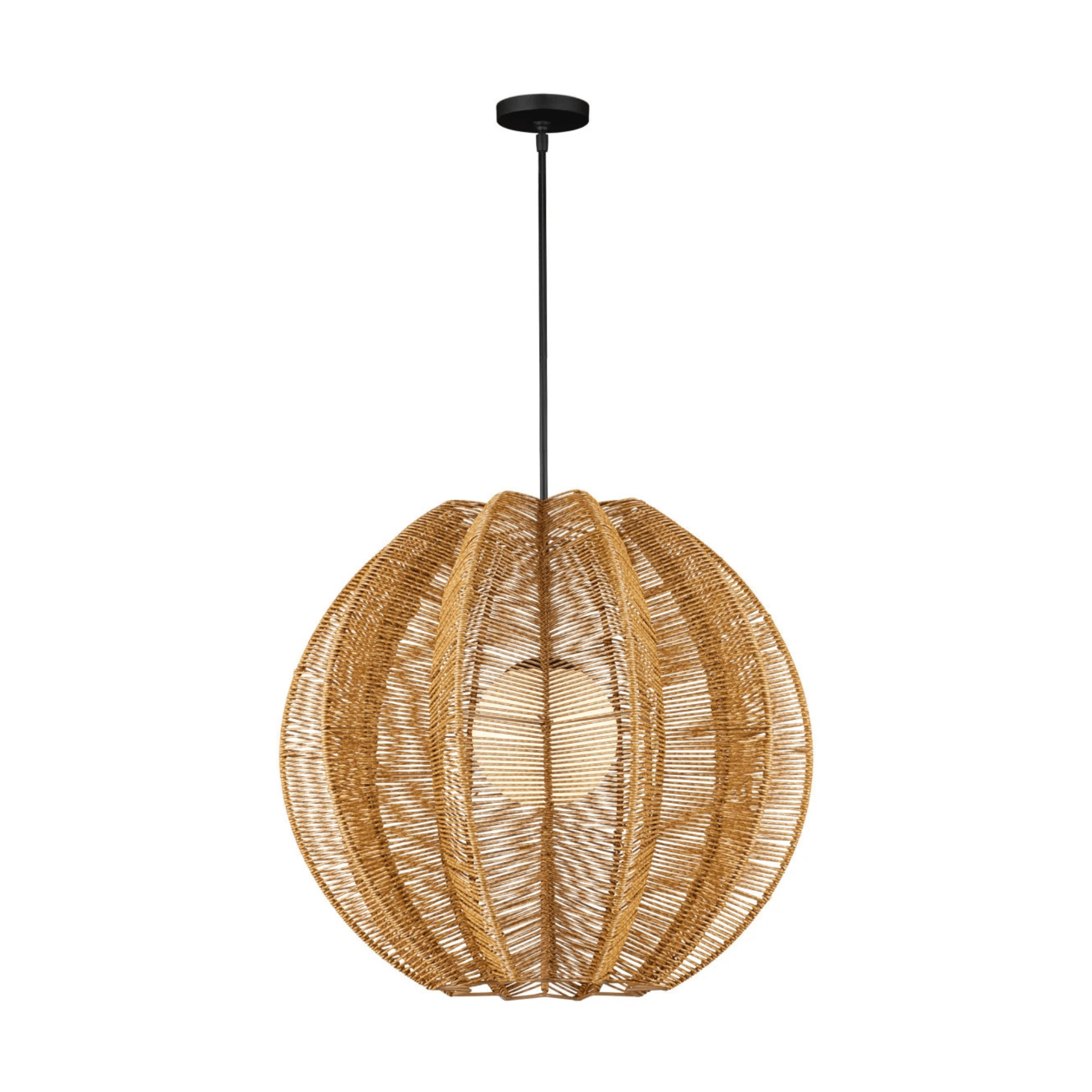 The Harbor Ridge Fluted Outdoor Pendant is made of all-weather wicker that can easily withstand the elements, as will the rod from which it hangs in a black powder-coated finish. An artisanal aspect of this tan pendant is the intricacy of the uniform weave hand-tied to create the starfruit shape of its profile. The milk-glass globe on the one-light pendant will illuminate the shade to reflect textural shadows on nearby surfaces. The fixture is wet location-tested so it is ideal for lighting patios and porches.