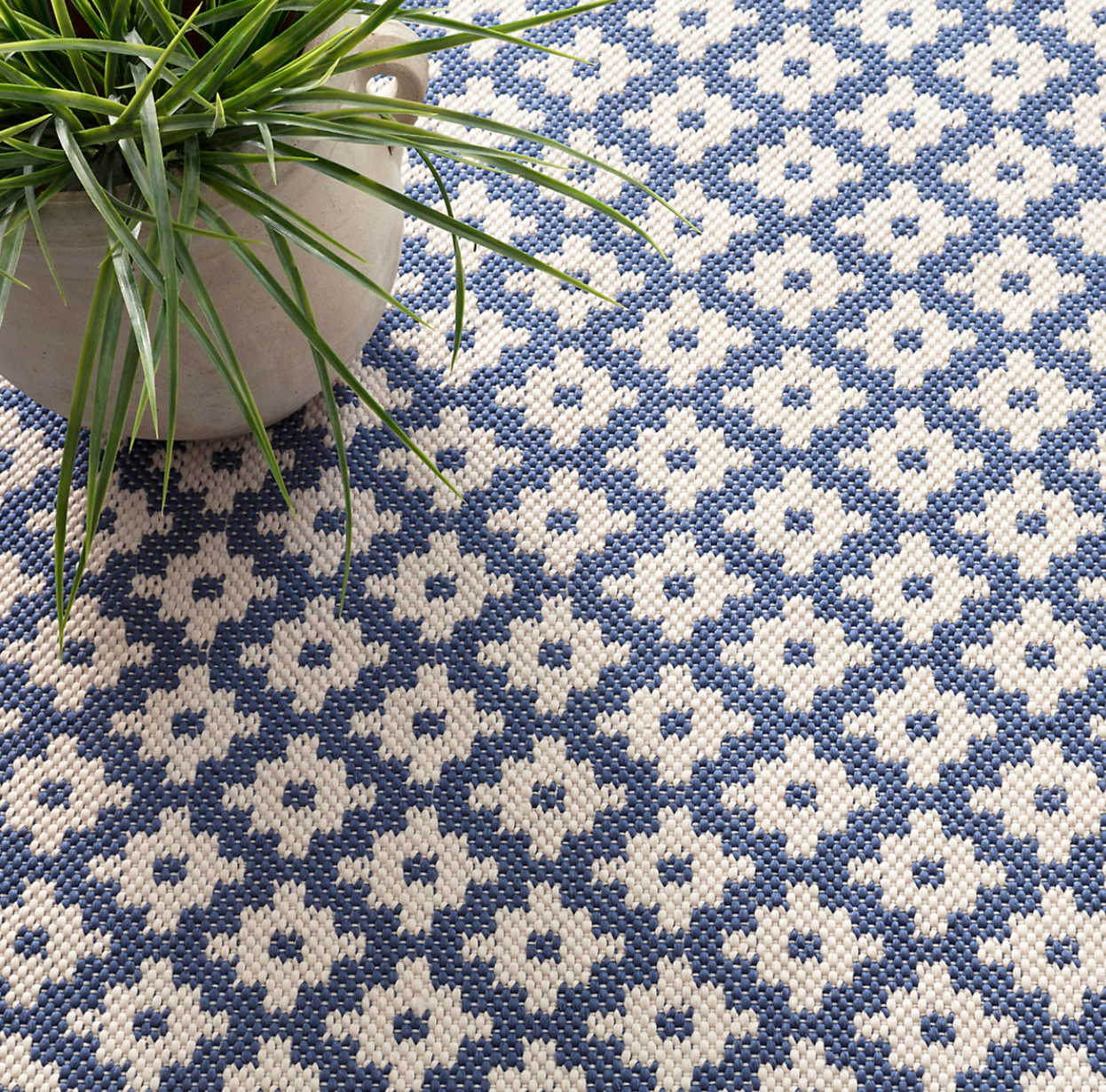 Inspired by the beautiful motifs of the Samode Palace in India, this lightweight and washable indoor/outdoor rug in denim blue and ivory is perfect for any high-traffic area.