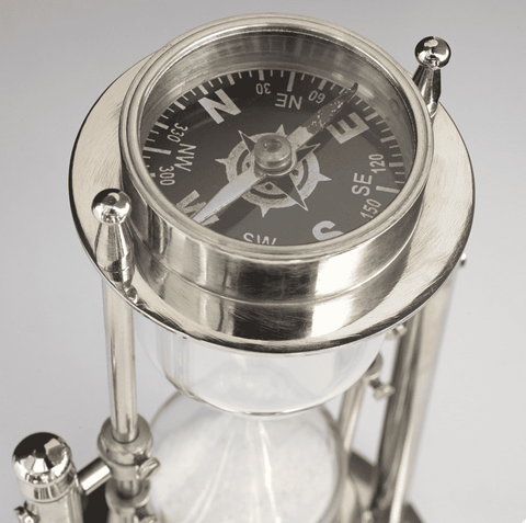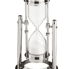 Honor the passage of time with this functional Sands of Time sculpture. A classic sand-filled hourglass rests with a nickel finish frame allowing for 180-degree rotation to mark the passage of time. Perfect maritime accent and shelf decor for any coastal home.