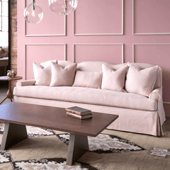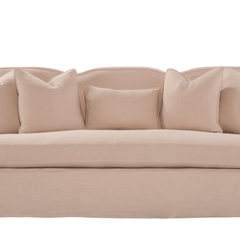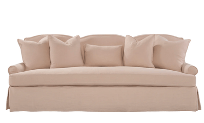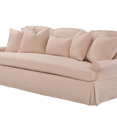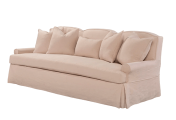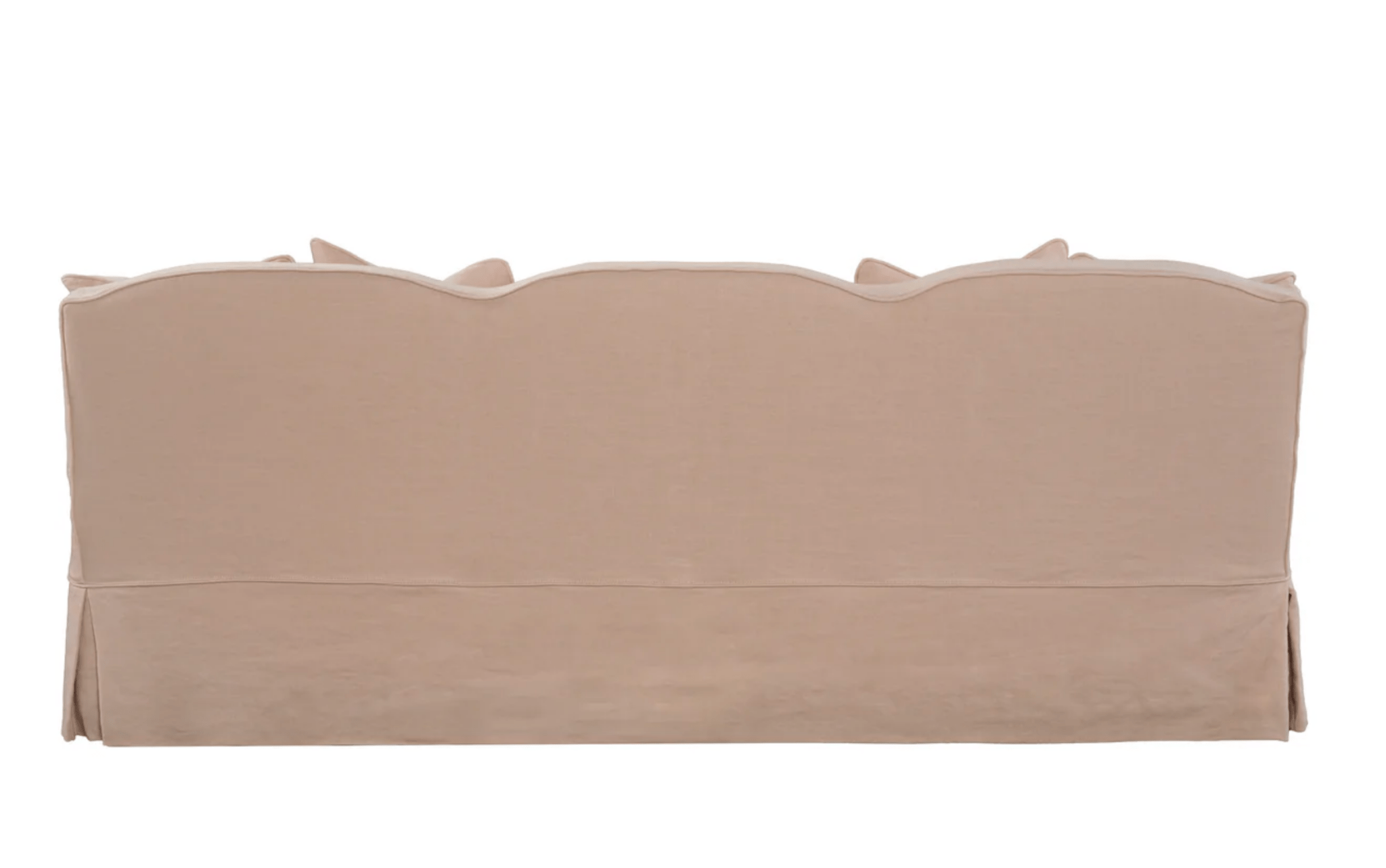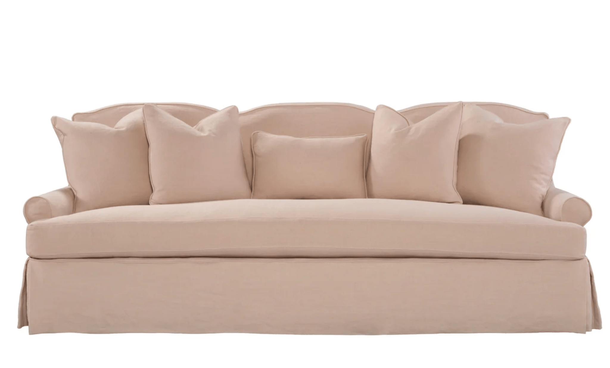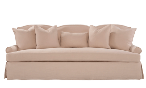 The Santa Clara Sofa reimagines classic lounging with a fresh, sophisticated twist on the timeless camelback design. Offered in both studio and full sofa widths, this slipcovered piece features a gently arched backrest with graceful humps that create a flowing silhouette—a nod to traditional craftsmanship. Plush, loose back pillows rest against the subtly contoured frame, echoing its elegant curves while delivering exceptional comfort. A tailored kick-pleat skirt extends to the floor, gracefully concealing the legs and adding a final touch of refinement.