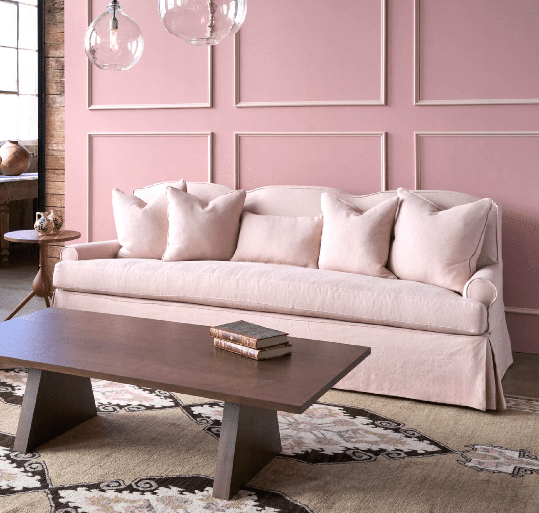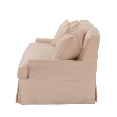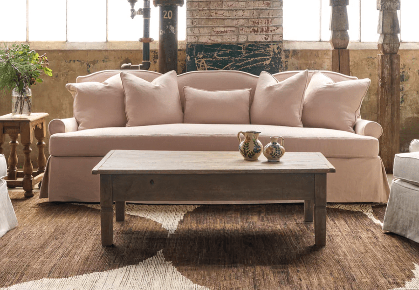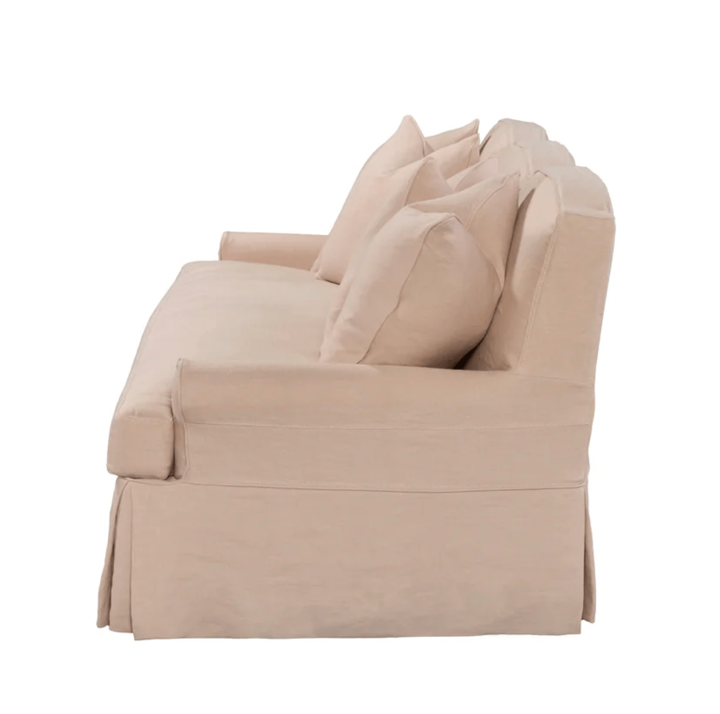 The Santa Clara Sofa reimagines classic lounging with a fresh, sophisticated twist on the timeless camelback design. Offered in both studio and full sofa widths, this slipcovered piece features a gently arched backrest with graceful humps that create a flowing silhouette—a nod to traditional craftsmanship. Plush, loose back pillows rest against the subtly contoured frame, echoing its elegant curves while delivering exceptional comfort. A tailored kick-pleat skirt extends to the floor, gracefully concealing the legs and adding a final touch of refinement.