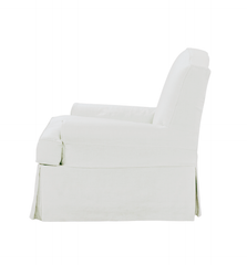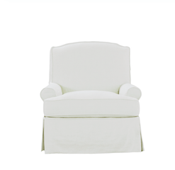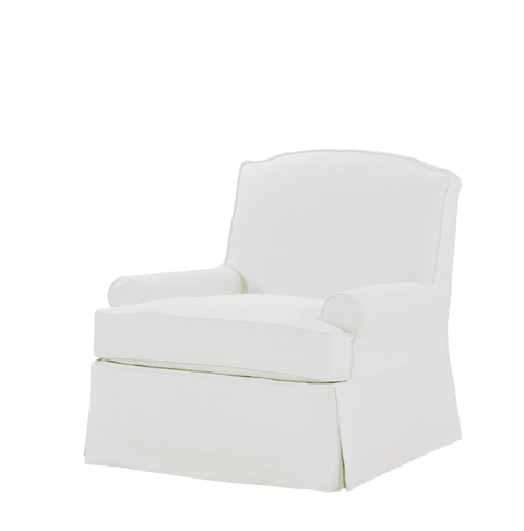 A refreshing update on a classic silhouette, the Santa Clara Slipcovered Swivel Chair has a sophisticated design with a gently arching backrest and plush seat offering both comfort and a refined aesthetic. A tailored kick pleat skirt drapes to the floor, concealing the swivel feature and adding an extra layer of sophistication.