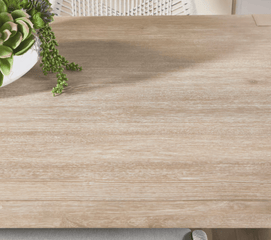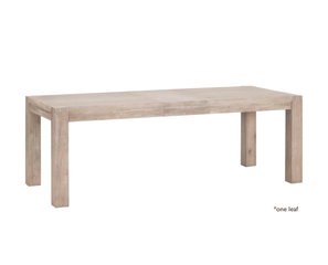 The Santorini Dining Table offers a modern shape with a coastal soul. It blends the clean lines of modern design with the breezy warmth of coastal style. Crafted from solid acacia wood and acacia veneer, its rich natural grain is beautifully highlighted by a soft, sun-washed finish reminiscent of seaside living. The streamlined silhouette feels contemporary, while the organic texture of the wood brings an inviting, relaxed charm to any dining space. Designed for flexibility, the Santorini includes two removable extension leaves—perfect for both intimate dinners and large gatherings. When fully extended, it offers generous seating with a width between legs of 93.75", and when not in use, the leaves can be conveniently stored separately.