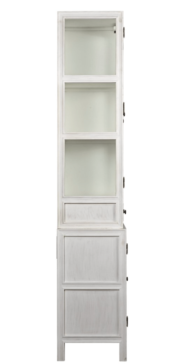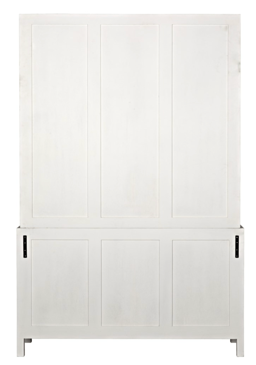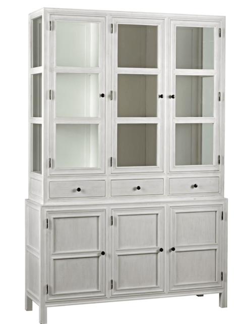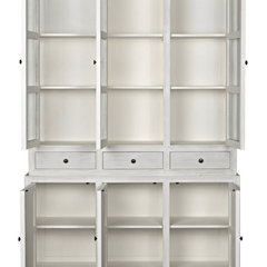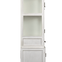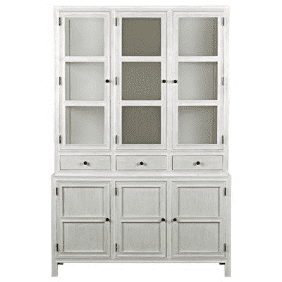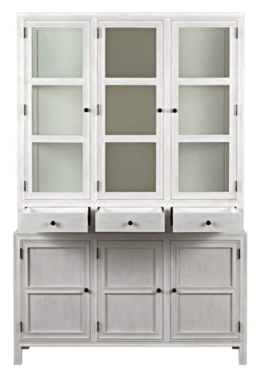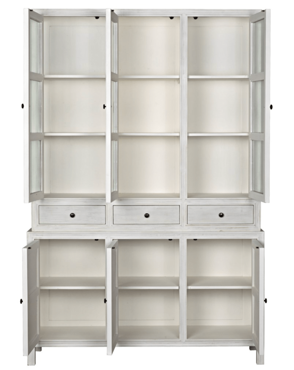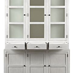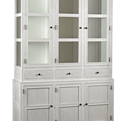 Simple yet beautiful, the Saratoga Colonial Style Hutch provides ample storage and display in a tall whitewashed cabinet. Glass upper cabinets with glass sides, finished interior as well as three drawers and three base cabinets with inset doors. Includes shelving for so many items.