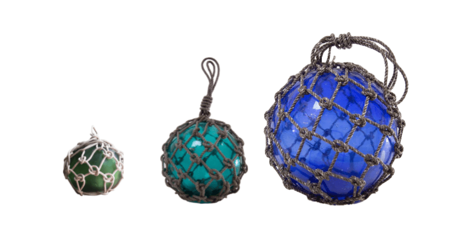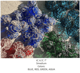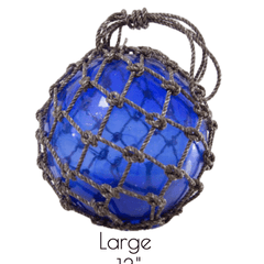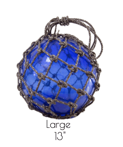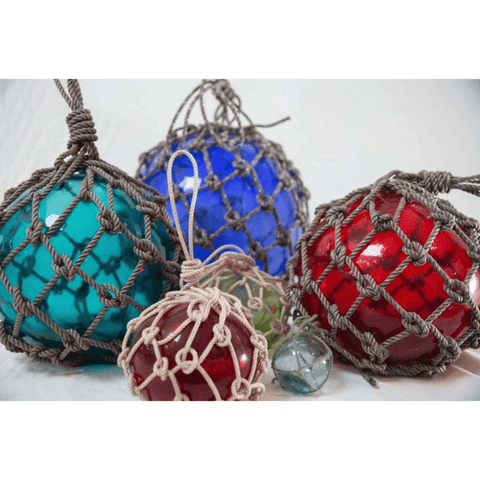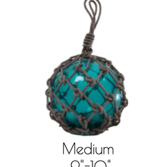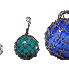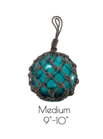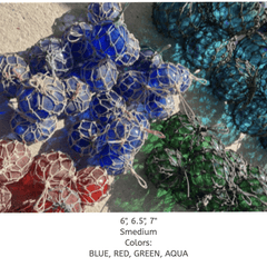 Seaglass floats are perfect for outdoor or indoor coastal decor. Use to accessorize shelves, coffee table, nook and more to bring the home by the sea.  Colored glass surrounded by knotted rope netting w/loop handle.