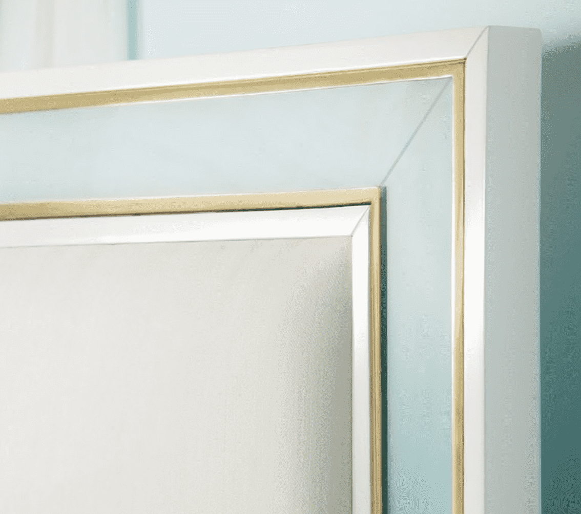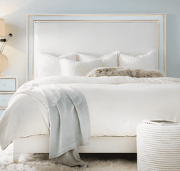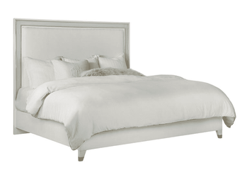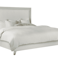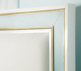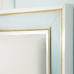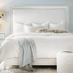 Create a serene retreat with the Seaglass Bed, where elegance meets coastal charm. Crafted from solid mahogany and finished in a pristine white, this bed features exquisite gold banding and sea glass acrylic detailing, bringing sophistication to any bedroom. The headboard is upholstered in natural white linen, offering both comfort and style. Whether you choose to use it with or without a box spring, this bed provides the flexibility to suit your preferences.