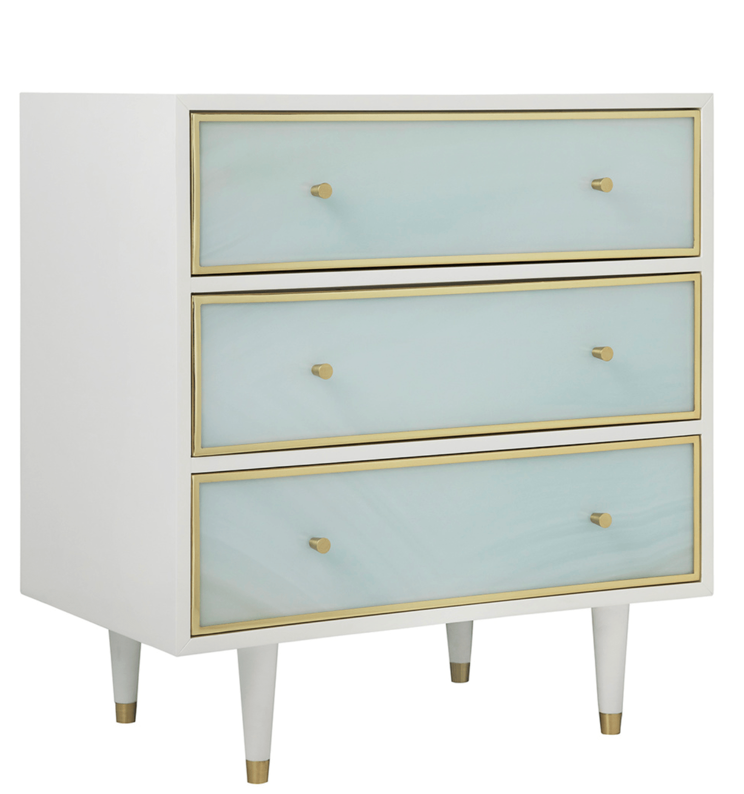 A gorgeous pairing for the Seaglass bed, this night table has three drawers with printed seaglass fronts with a frame crafted of painted white wood resting on a mid-century modern leg capped in brass.