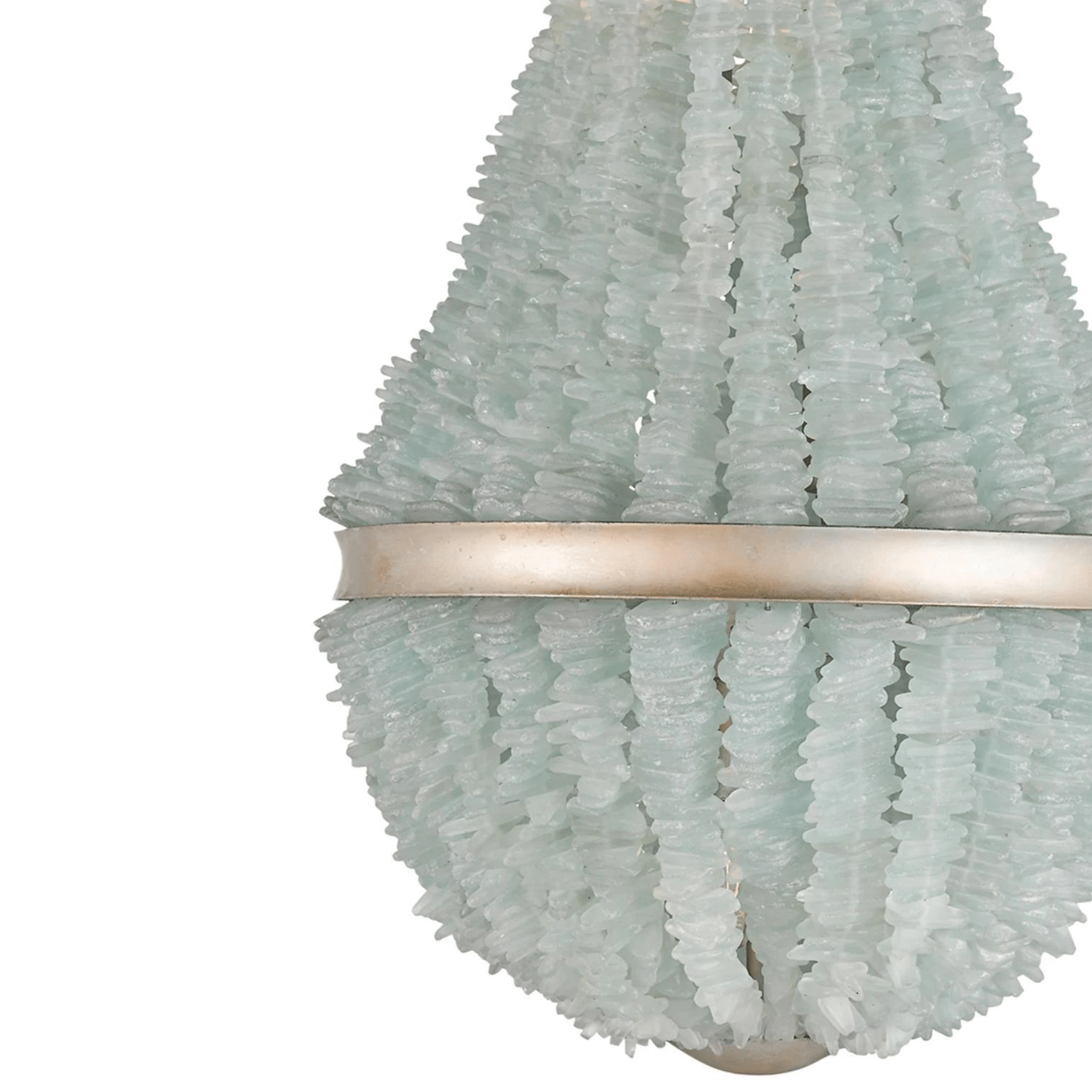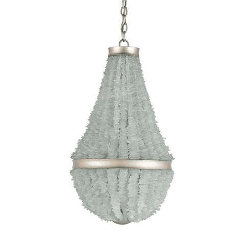 Organic materials inspired the Southborough Sea Glass Chandelier because it's encrusted with carefully chosen natural sea glass embellishments. The material is earthy while the classic silhouette and the contemporary silver leaf finish are formally sophisticated. The finish and the sea glass combined make this a gleaming luminary.