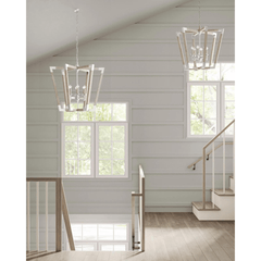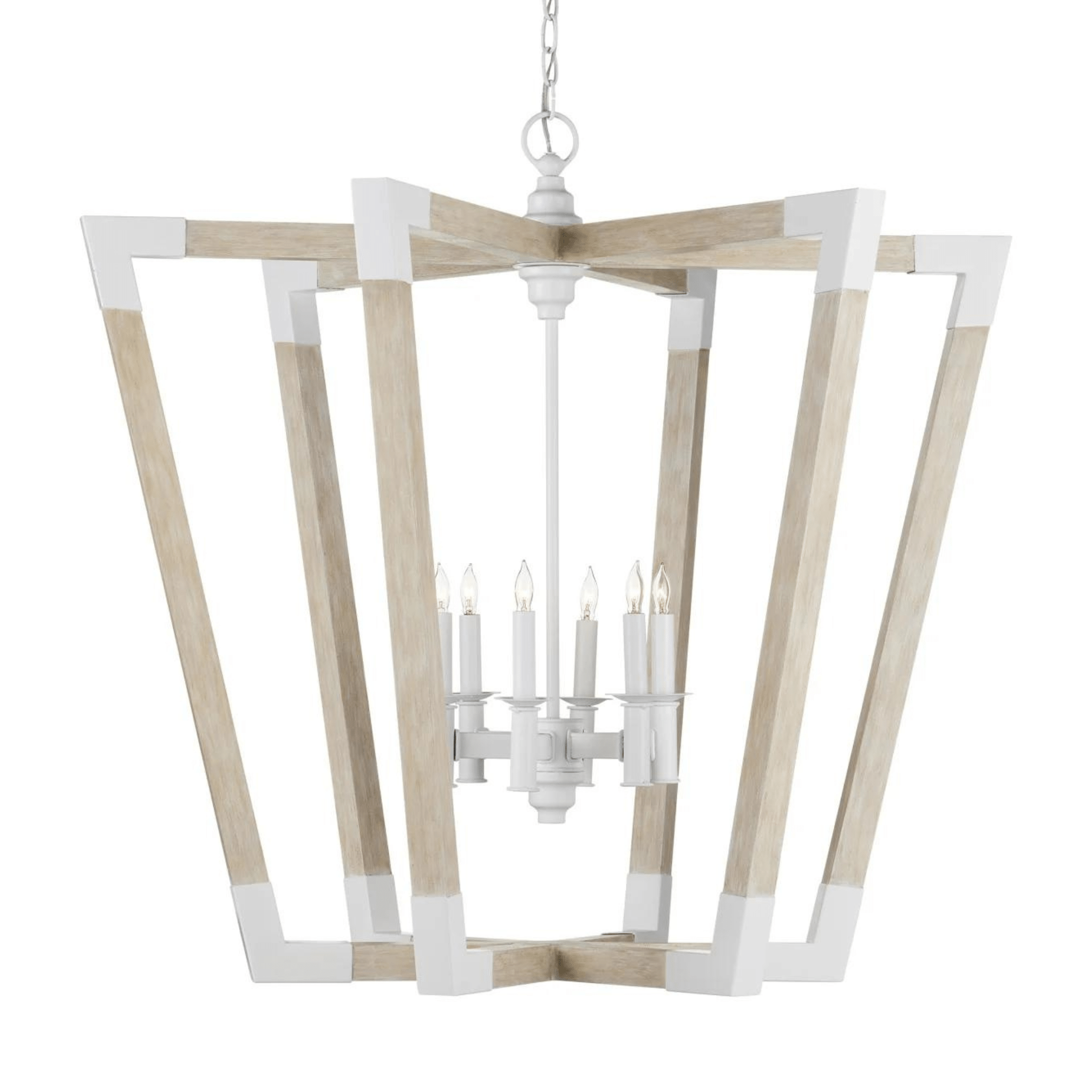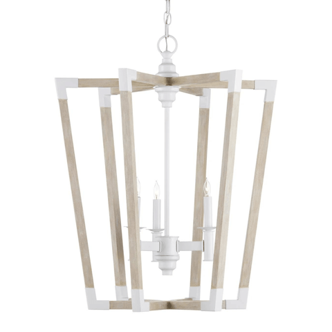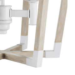 The Arts & Crafts movement inspired the design of the Sebastian Sandstone Lantern, which is made of wrought iron and wood in sugar white and sandstone finishes. The crisp feel of the white metal clasping the spokes of washed wood brings extra sophistication to this lantern-shaped chandelier.