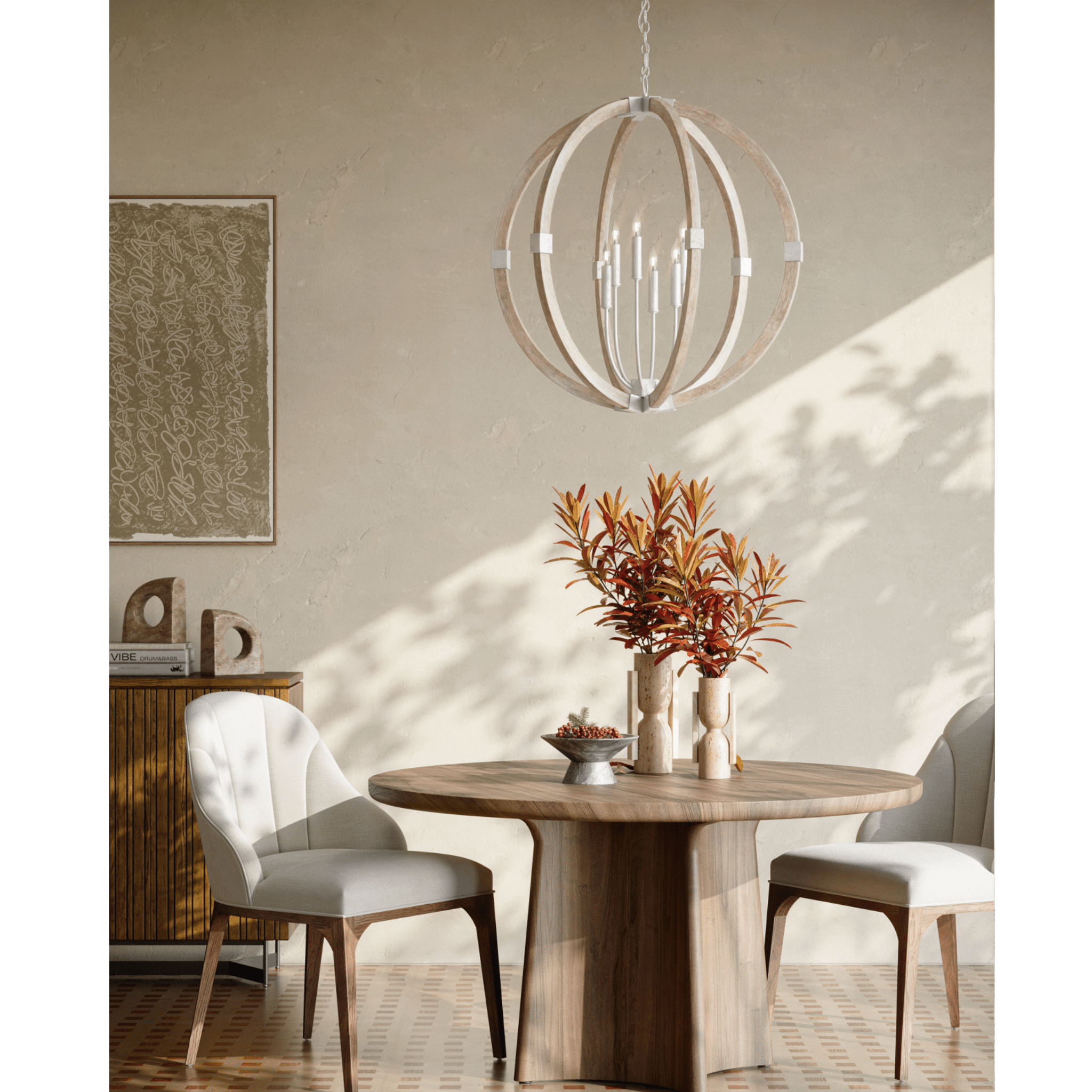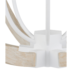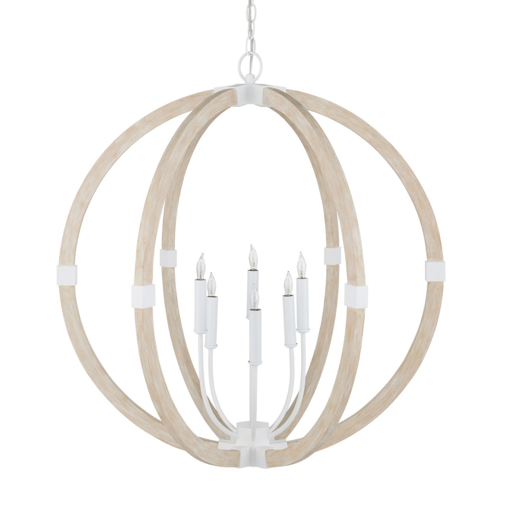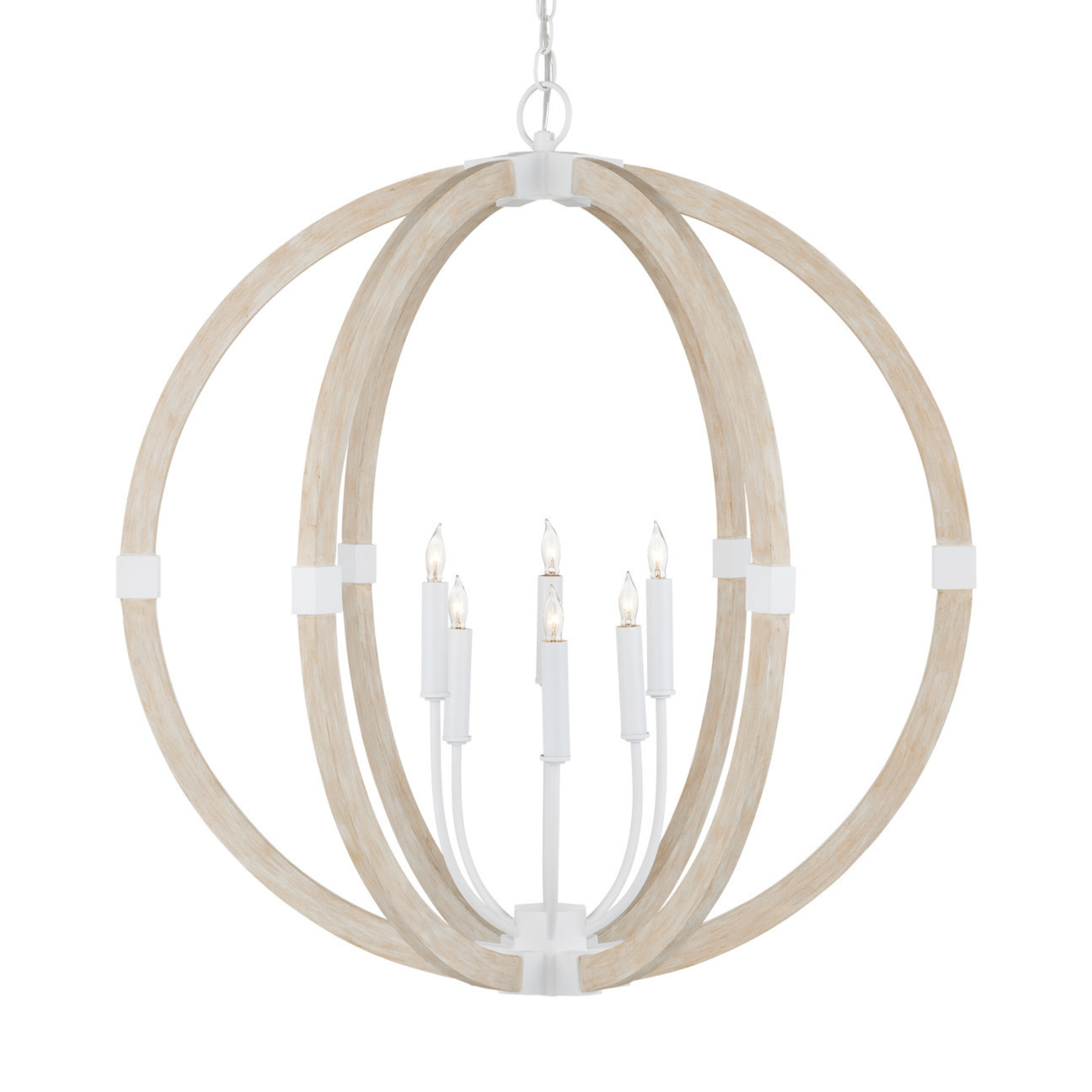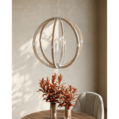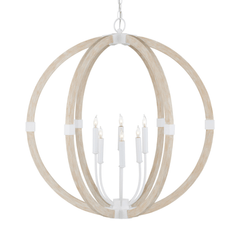 The Arts & Crafts movement inspired the design of the Sebastian Sandstone Orb Chandelier, which is made of wrought iron and wood in sugar white and sandstone finishes. The crisp feel of the white metal clasping the spokes of washed wood brings an extra sophistication to this fixture. The pale finishes on this bleached-wood chandelier bring the classic shape a sense of modernity.