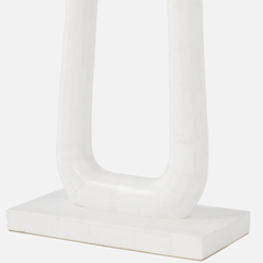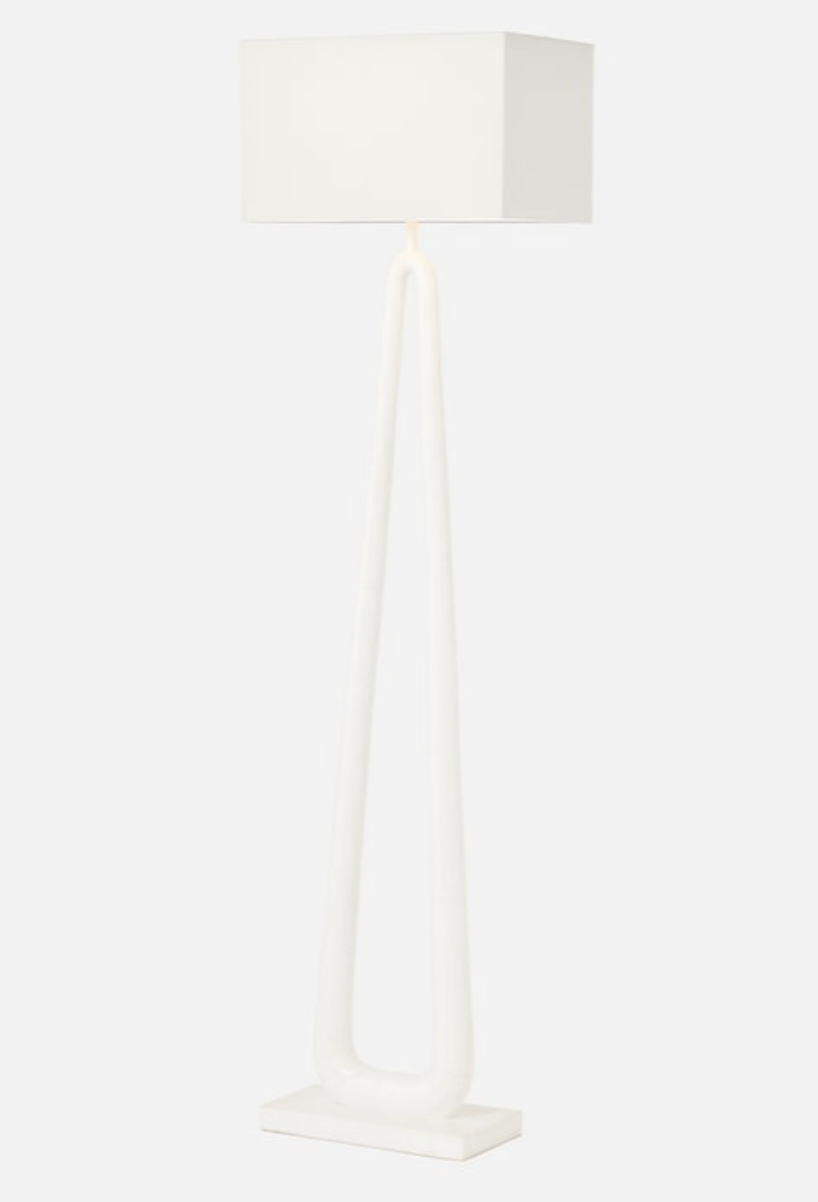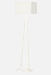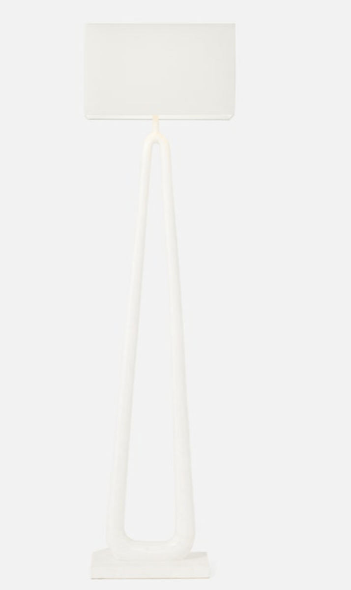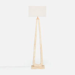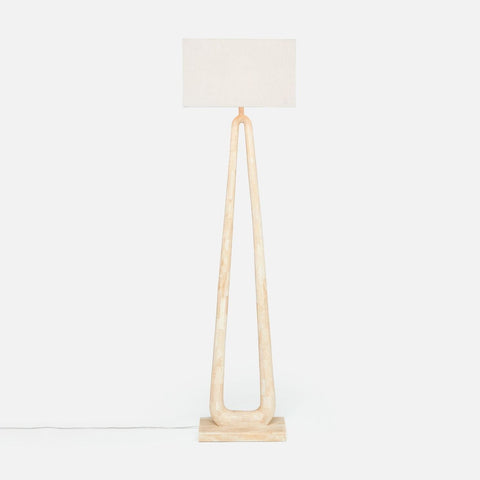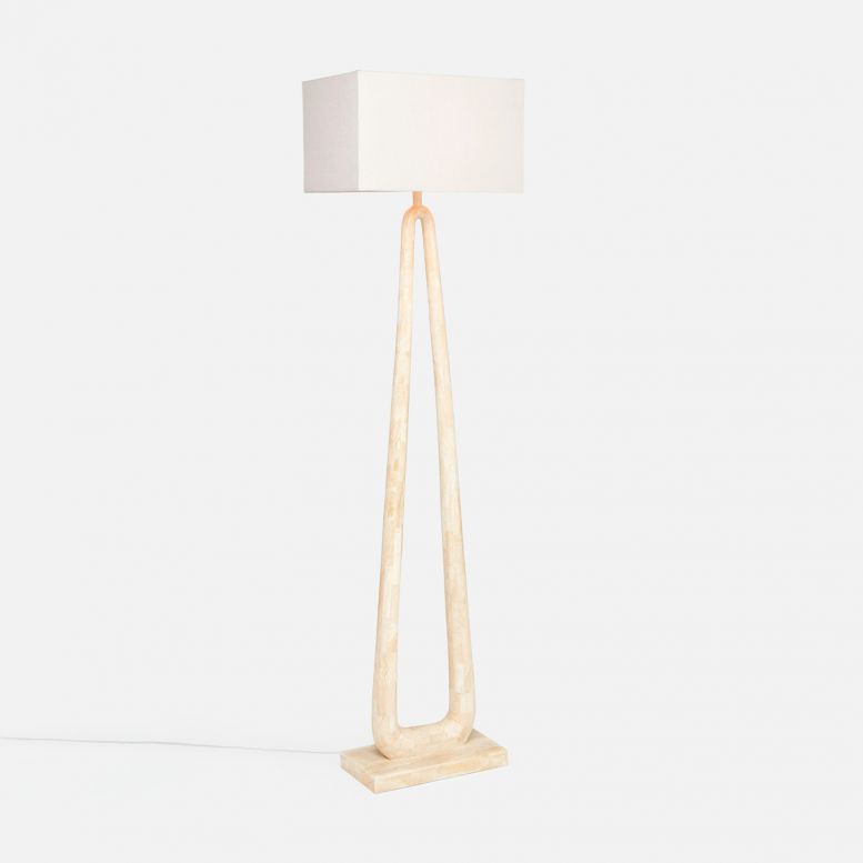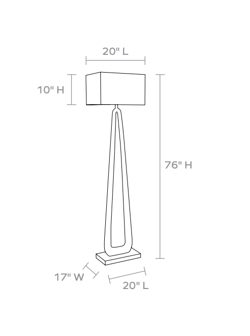Can a floor lamp be a conversation piece? Why, yes, it can. The sculptural design of the Wellington starts with the curved stone base where the sides join at the top of the floor lamp finished with a linen rectangular shade. Nice and open, it's a striking piece that doesn't overpower a space. Available in two finishes: wood