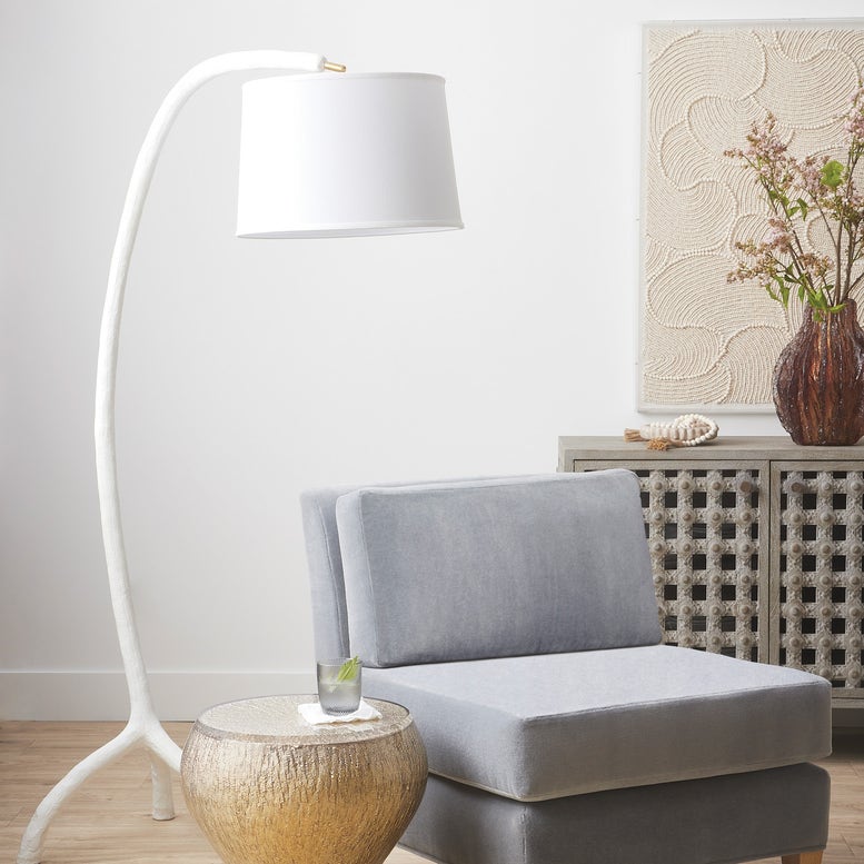 Shaped into a whimsical, abstract form, the Shona Arc Floor Lamp features a tripod base, cast in a Faux Bois textured resin, brushed brass hardware, and hanging fabric shade. It adds an organic, coastal touch to any setting and makes the perfect reading lamp with the shape - add to a chaise for the perfect reading nook.