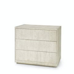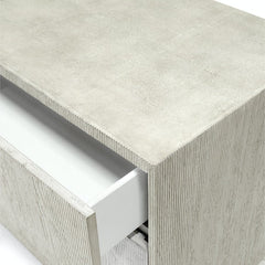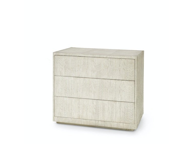 The Shoreline Bedside Chest features a solid hardwood frame accented with resin fiberglass reeded details on drawer fronts and faux shagreen on top all in a white wash finish. Nightstand features three drawers all with touch latch self-closing mechanism.