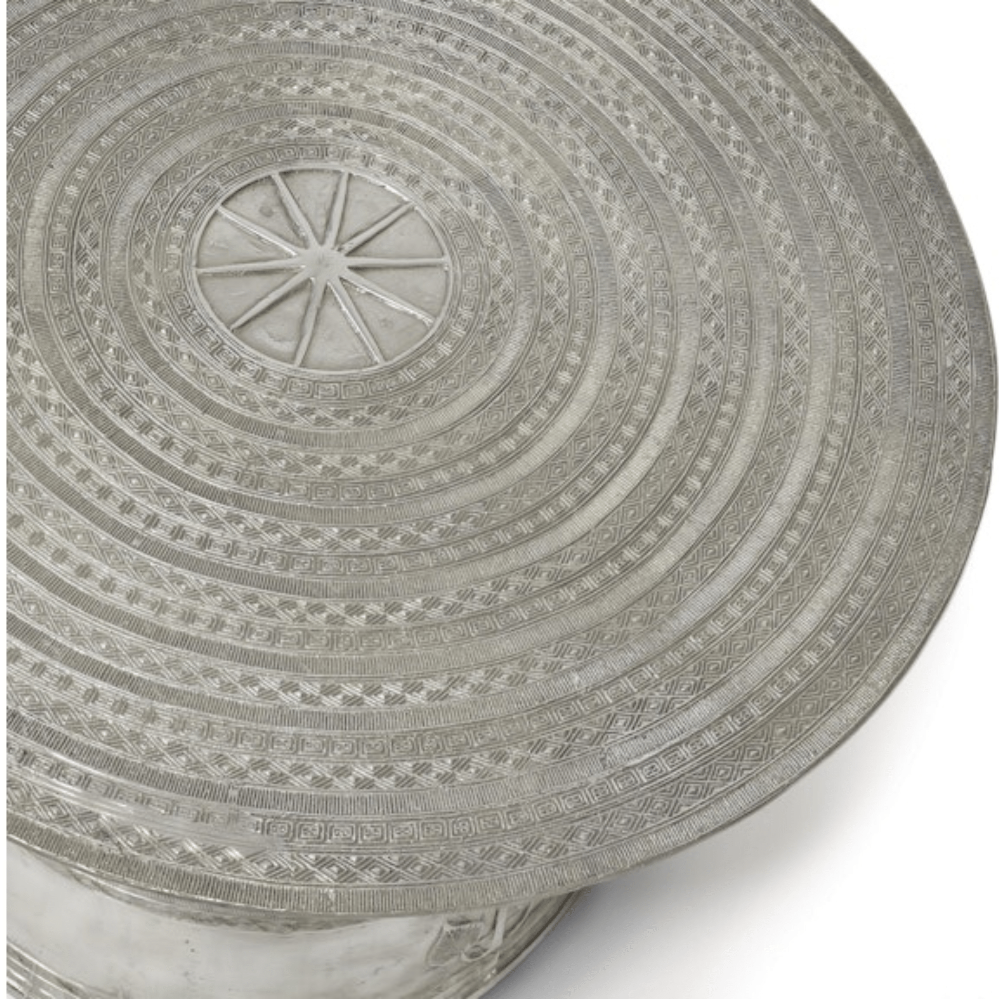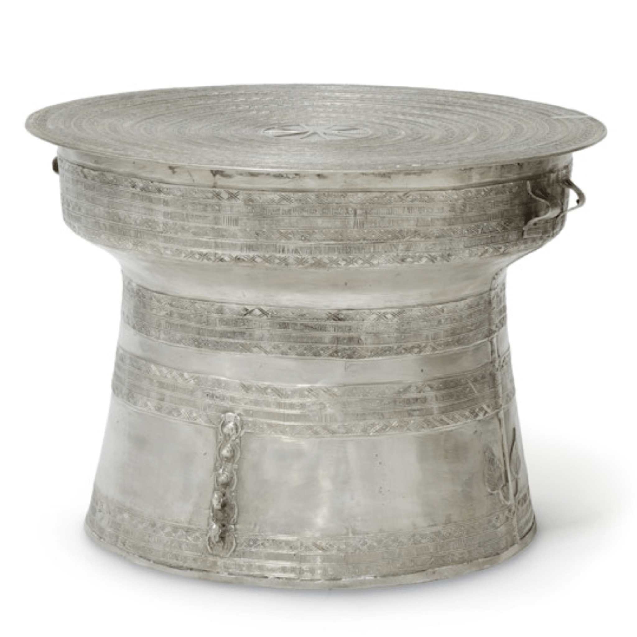 Pressed brass hand-forged drum in a silver finish. Suitable for outdoor use, however, will patina when exposed to the element.