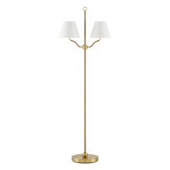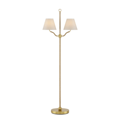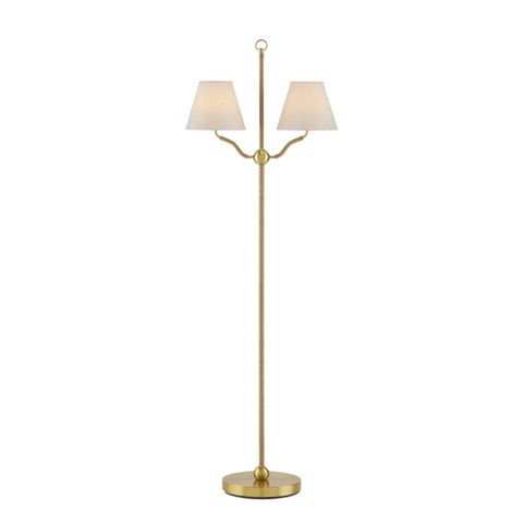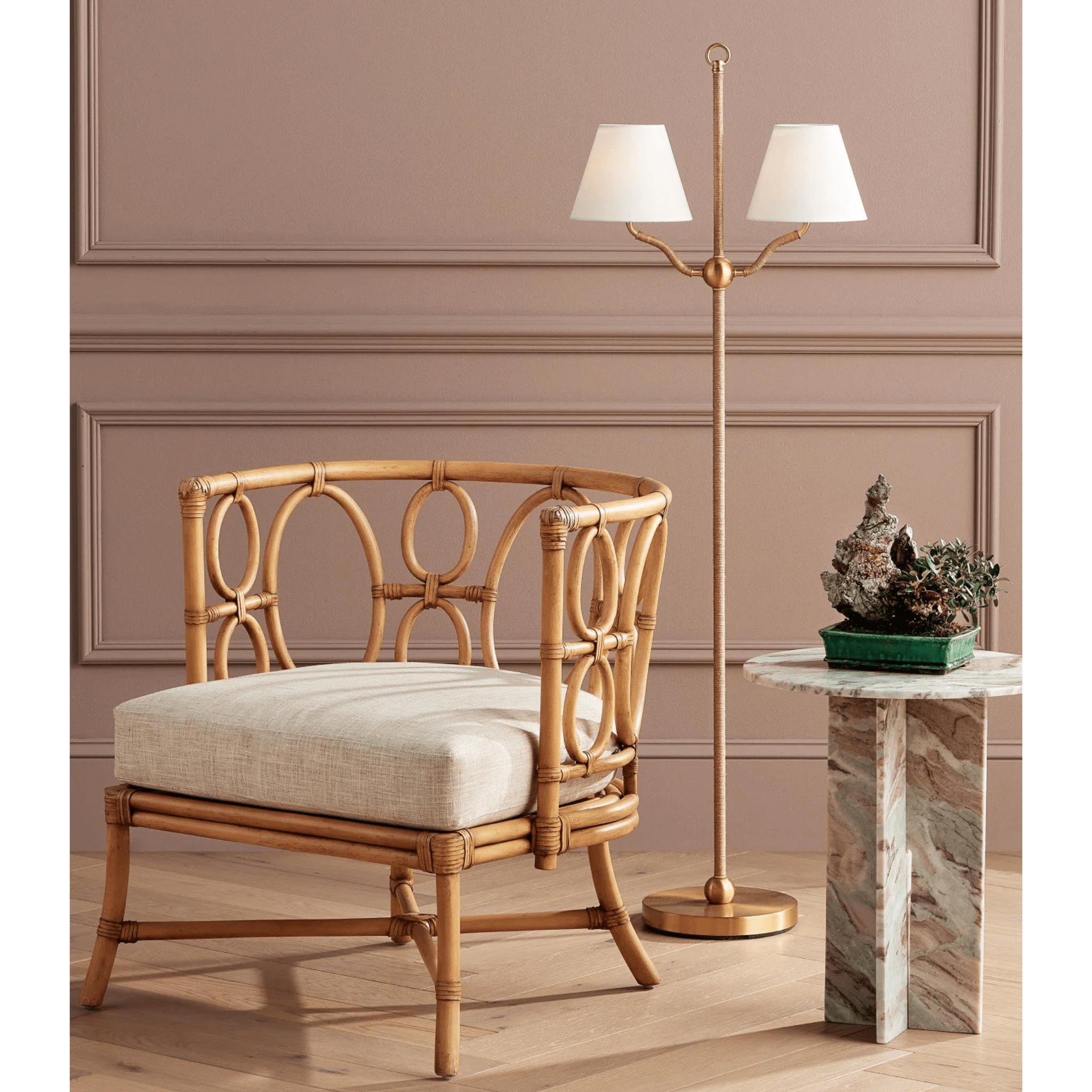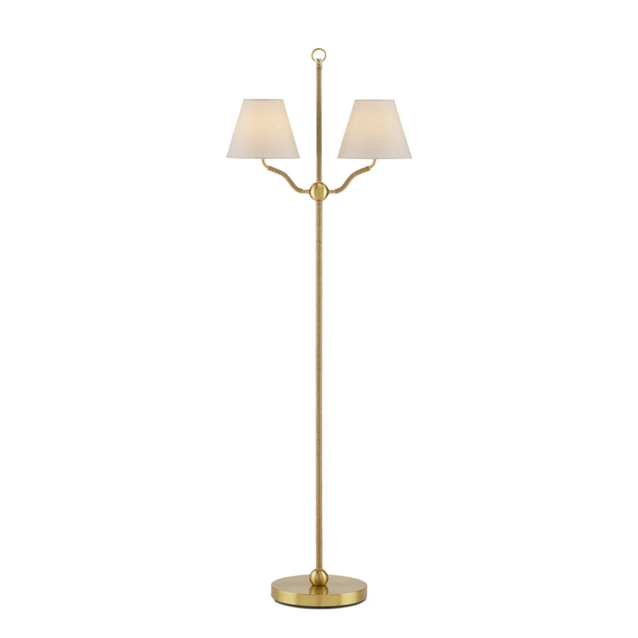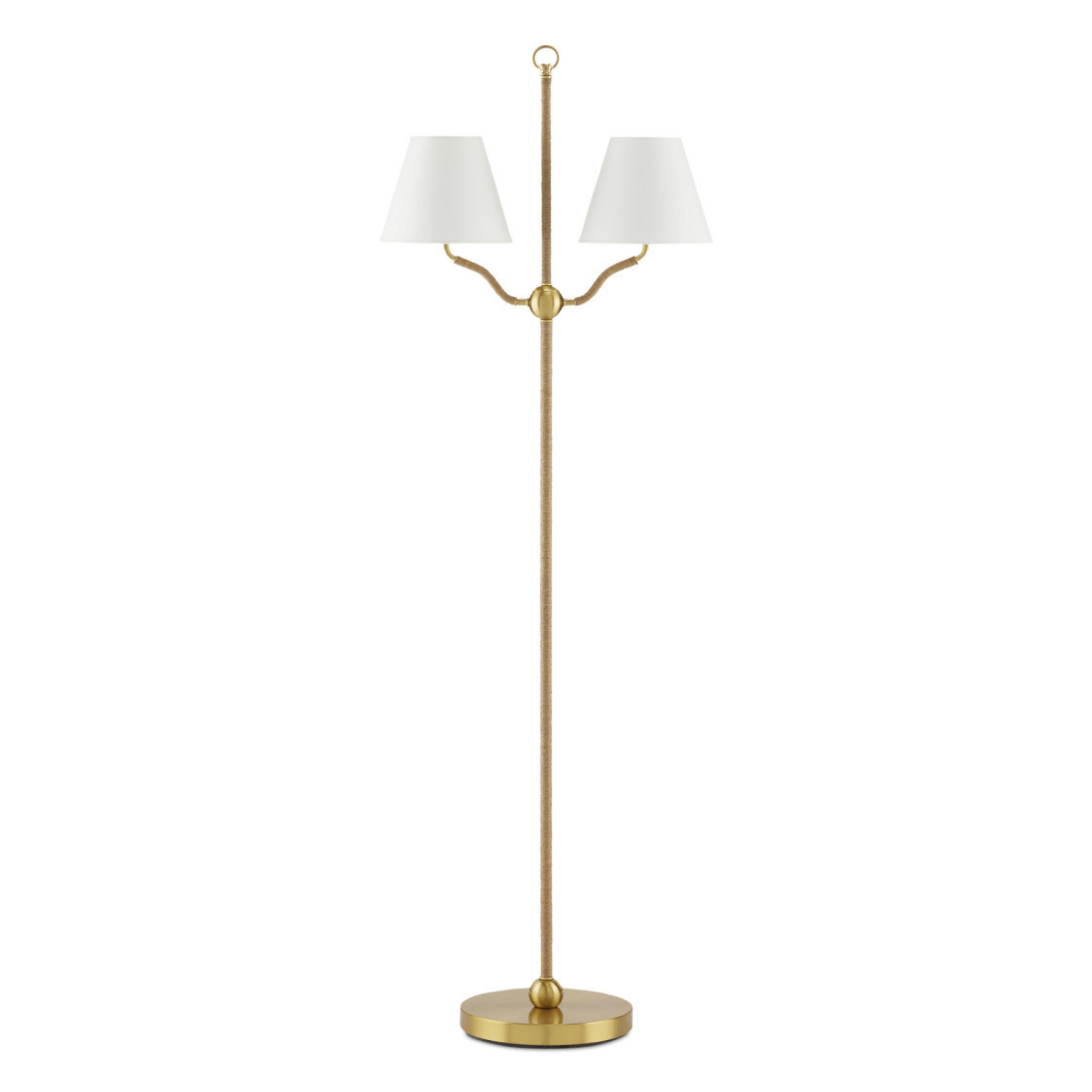 Tom Caldwell created a light profile for the Sirocco Floor Lamp and wrapped all but the main decorative elements in jute rope. These include the ring at its apex, the small globes at its base and the one connecting the forked arms, and the base itself. Made of steel and natural plated antique brass, the rope floor lamp is fitted with two off-white linen shades. This is a petite floor lamp designed to be a decorative accent in a space.