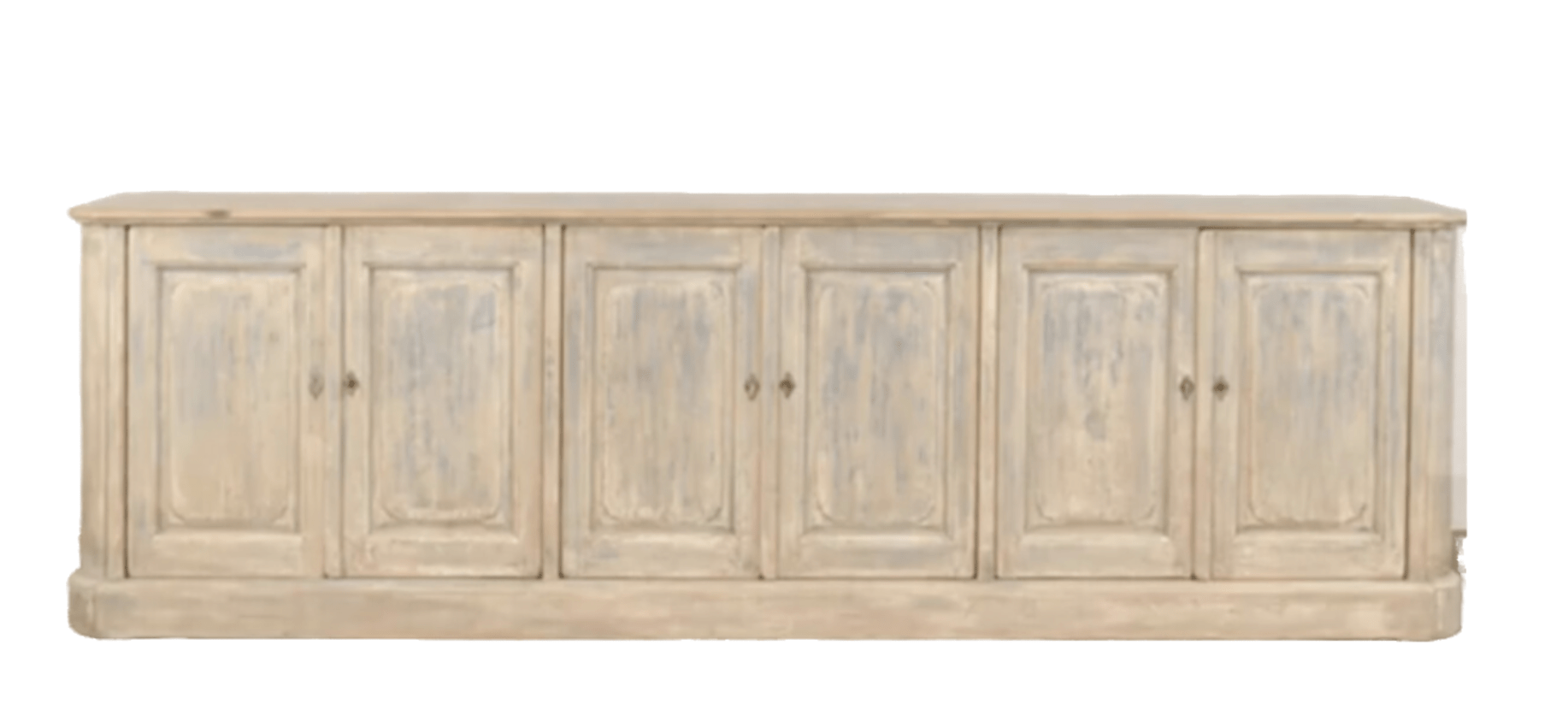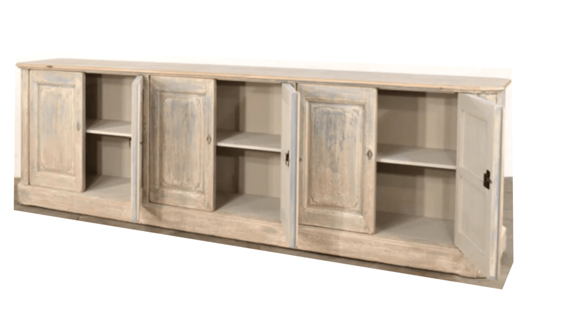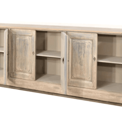 The North Harwich Sideboard is available in four doors or six doors, both showcasing a blue wash distressed painted finish and a finished top. Behind these lockable doors are shelves with plenty of depth for storage. The muted blue painted finish works with almost any decor.
