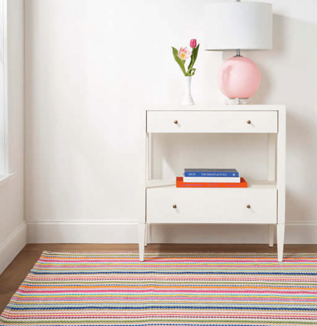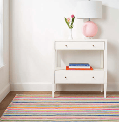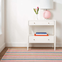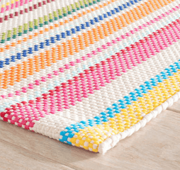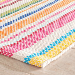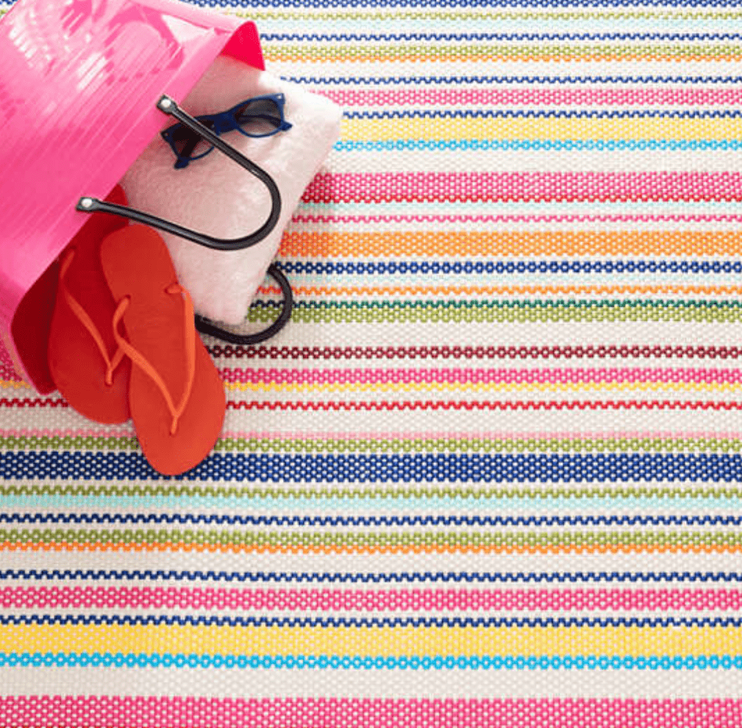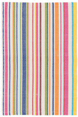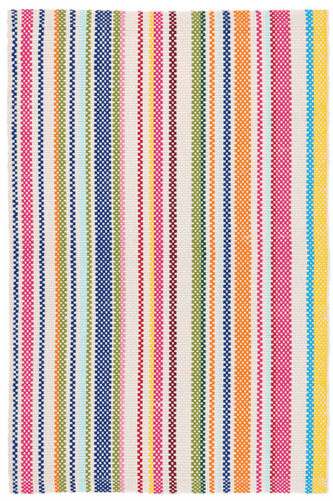 Vertical chambray awning stripes of Navy, Sprout, Lemon, Tangerine, Fuchsia, Pink, French Blue and Turquoise weave their way down a simple white ground in this playful, happy, reversible flatweave rug. Like the rest of our indoor/outdoor breeds, it’s perfect for high-traffic areas such as family rooms, playrooms, or any room that needs playful pops of juicy, delicious color.