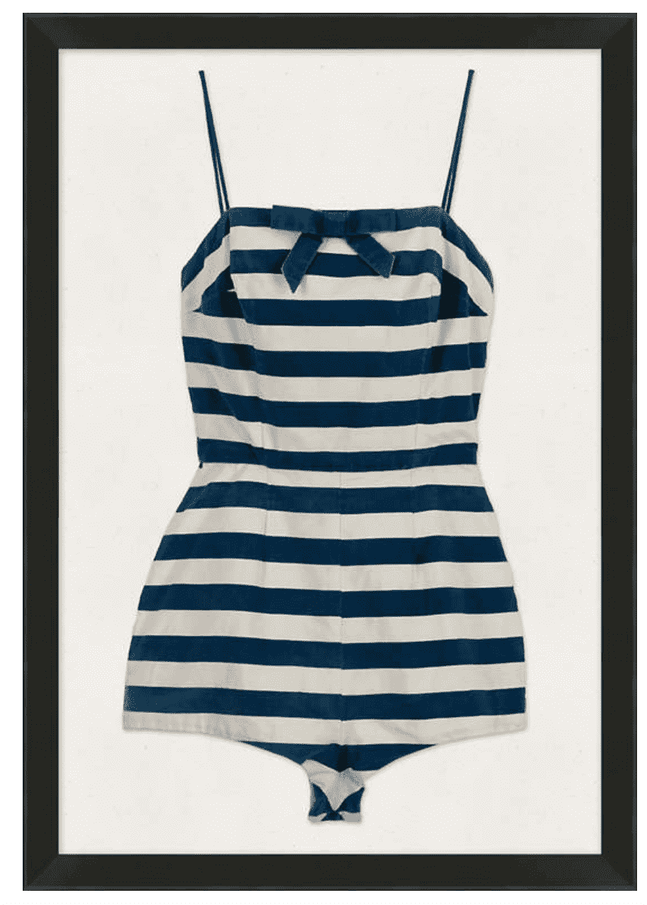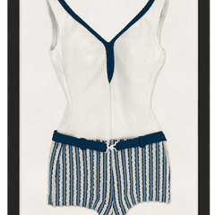 Elevate your coastal home decor with our Vintage Deauville-Style Swimsuit Giclee Prints, a perfect blend of nautical charm and playful elegance. Featuring navy and white one-piece swimsuits inspired by classic Deauville style, these photographic prints bring a touch of beach house glamor to any room. The high-quality giclee printing ensures sharp details and vibrant tones, making each piece a standout addition to your seaside home decor.