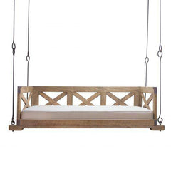 This rustic wood and iron hanging bed is absolutely unique. Beautiful "X" back sides and back, this hanging bed would be great for a porch or bedroom.