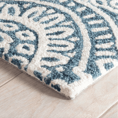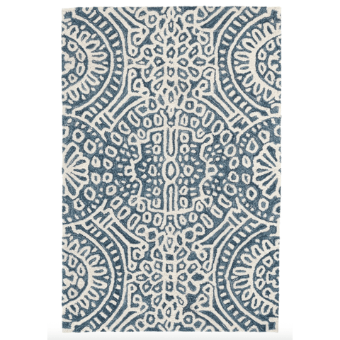 Build a cozy and welcoming sanctuary with this micro-hooked wool rug. Featuring a pattern reminiscent of stained glass on a rich inky blue background, this area rug brings a bit of serenity and spirit to any space it inhabits.