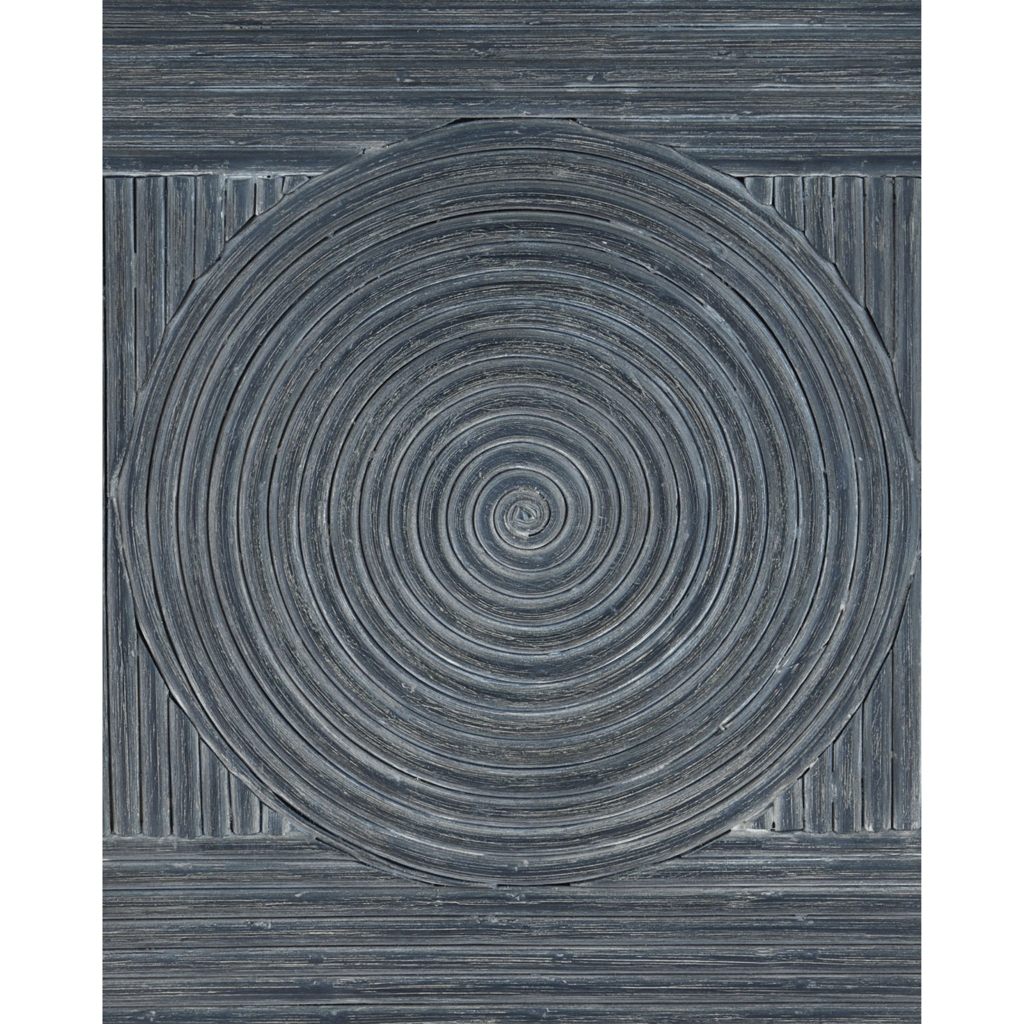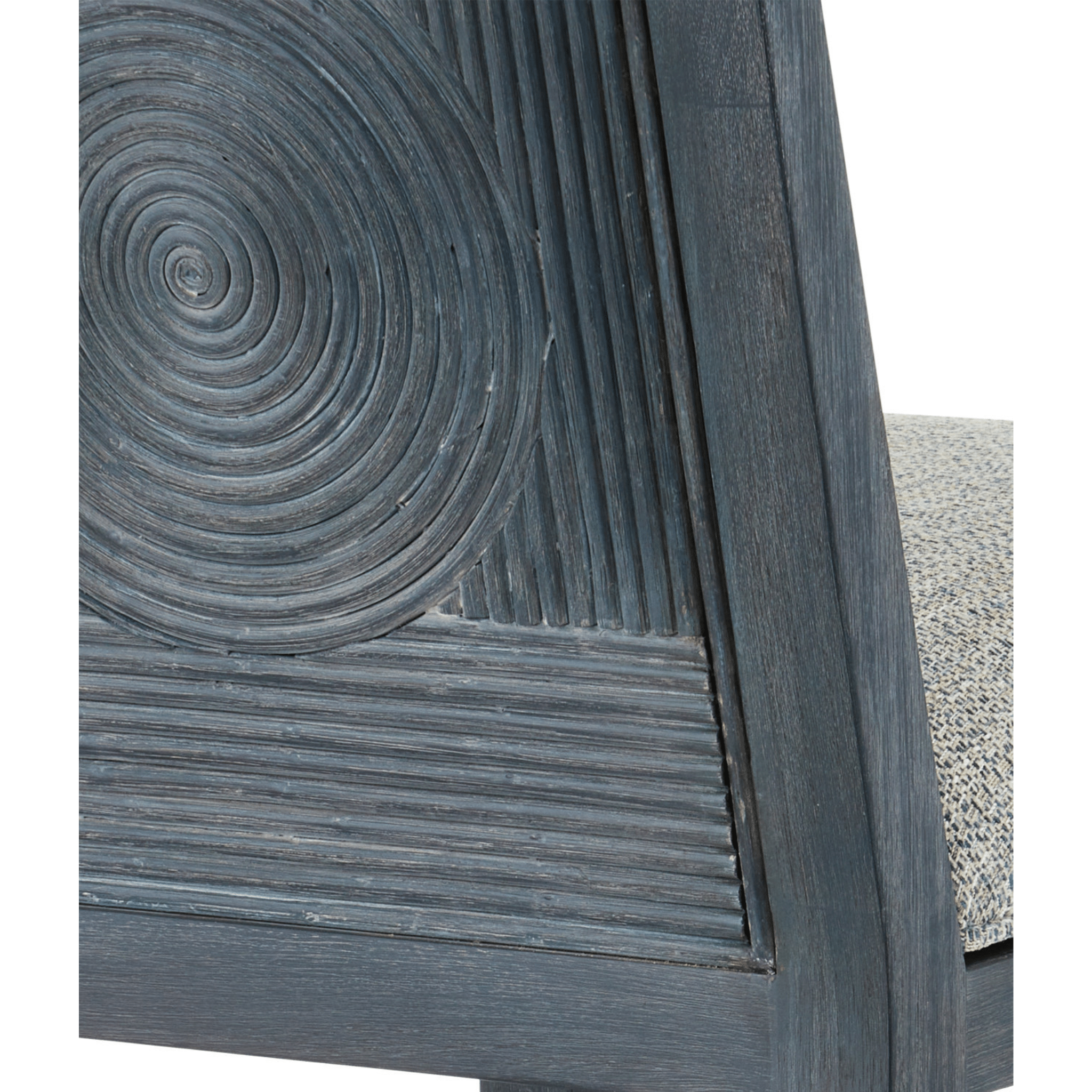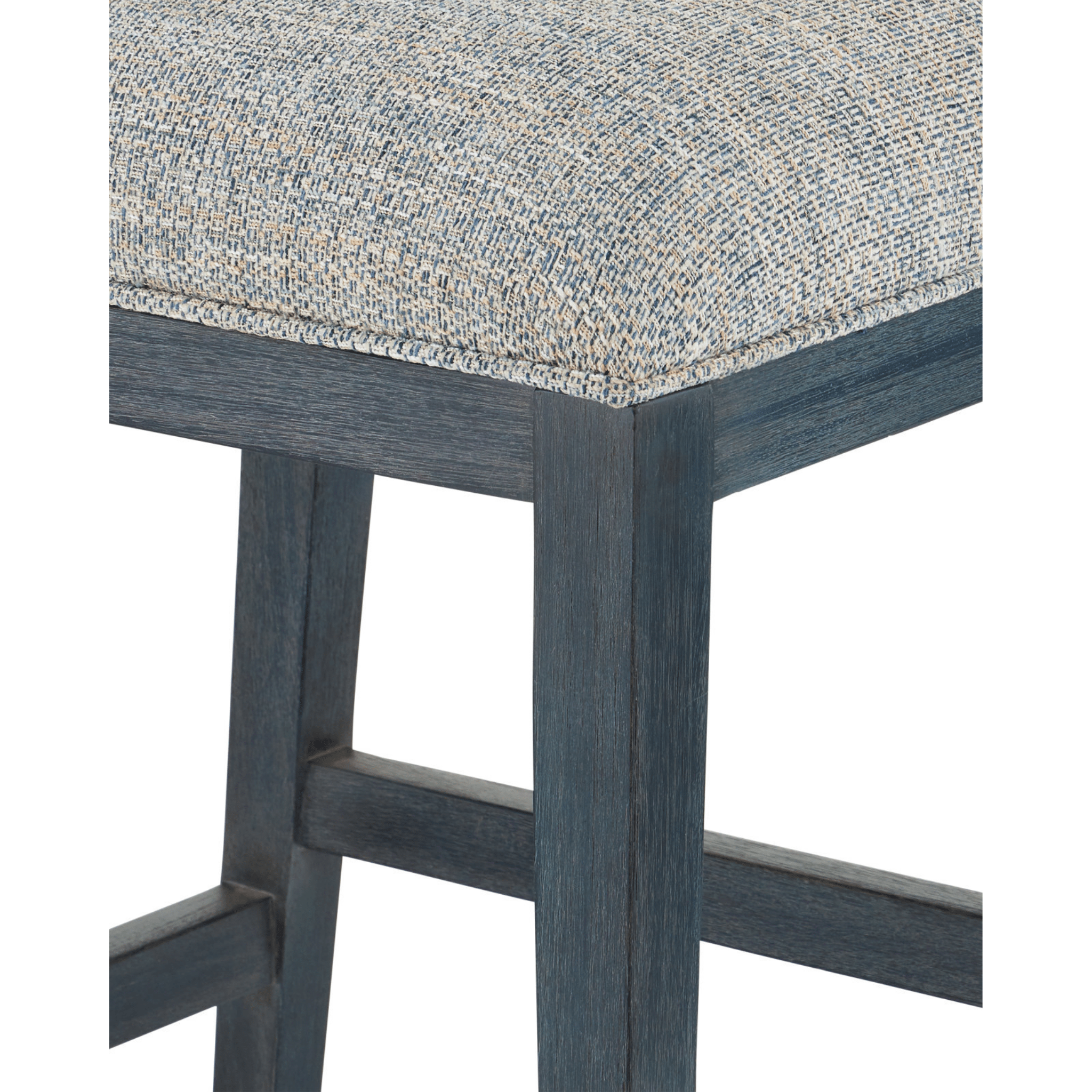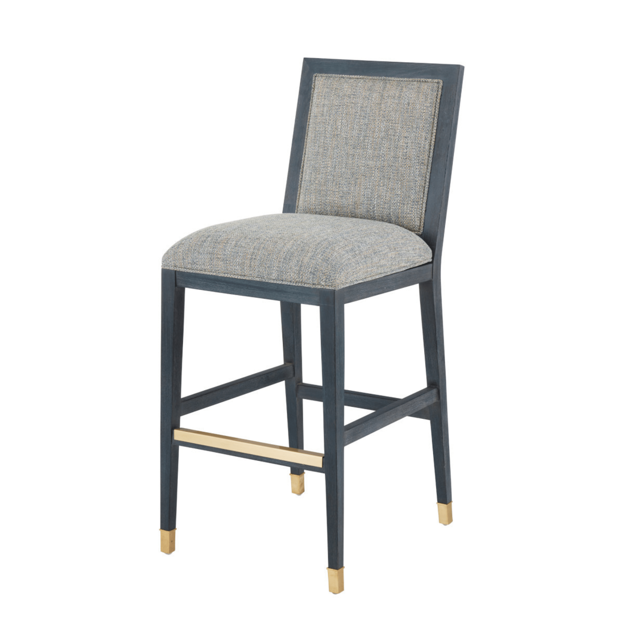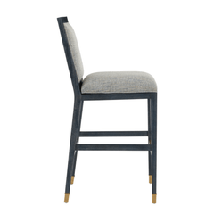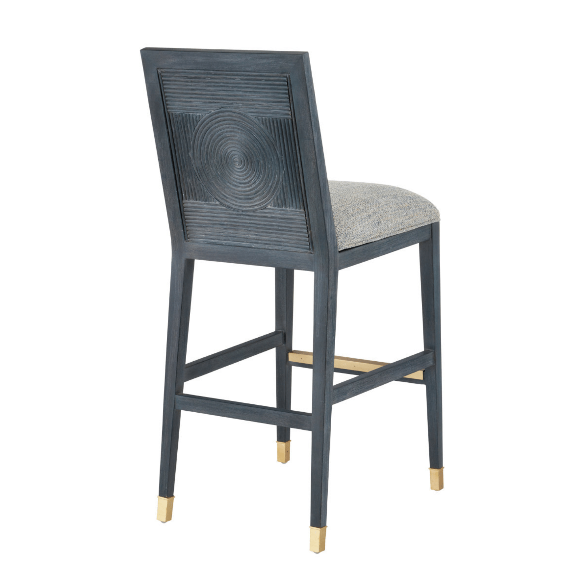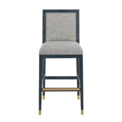 The Treasure Cay Navy Bar Stool has a split rattan pattern on the back, which is made by hand and applied to a solid mahogany frame. Once the natural material is in place, a vintage navy finish covers the back, frame, and legs. The blue bar stool is upholstered in a Barrett Dusk material. The stool has brass ferrules with a capped step to add sophistication to the overall design.