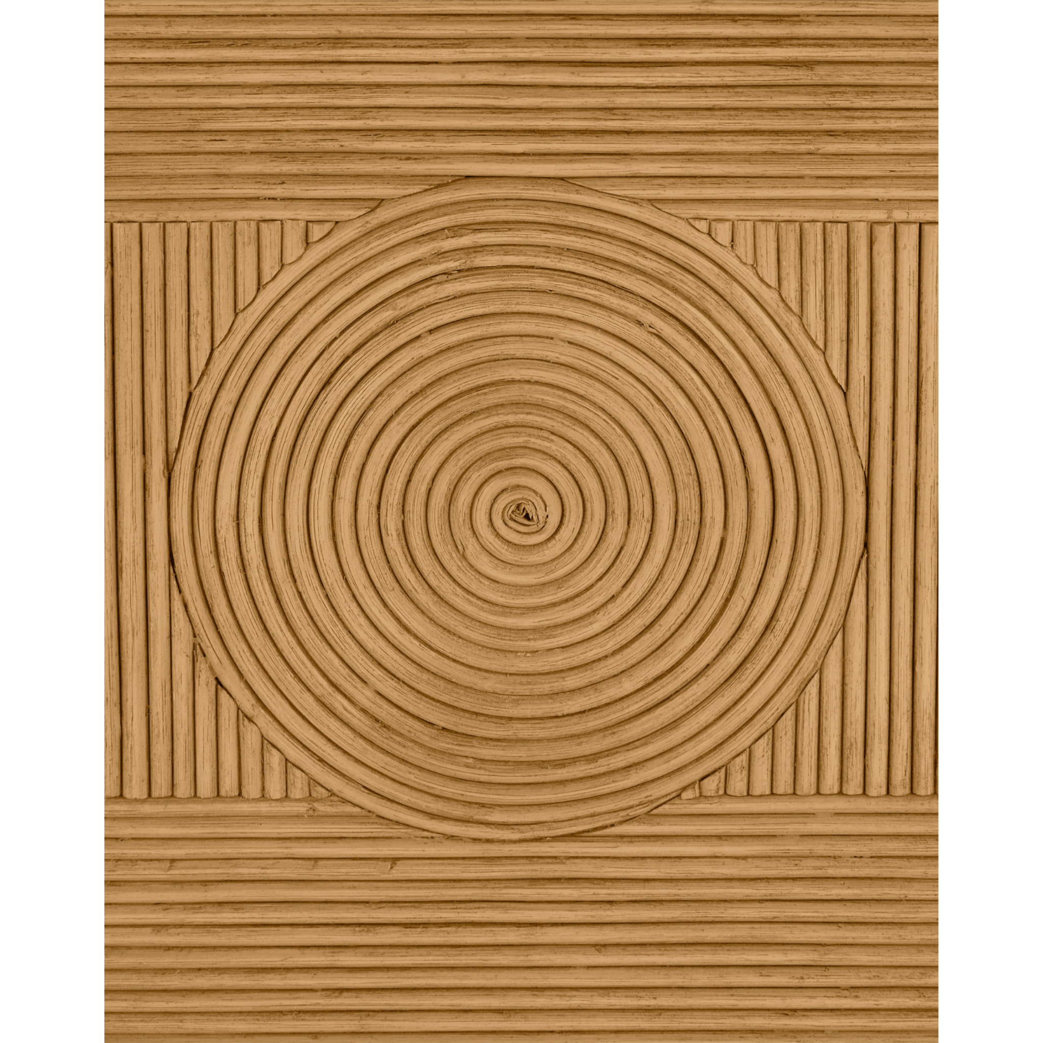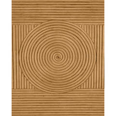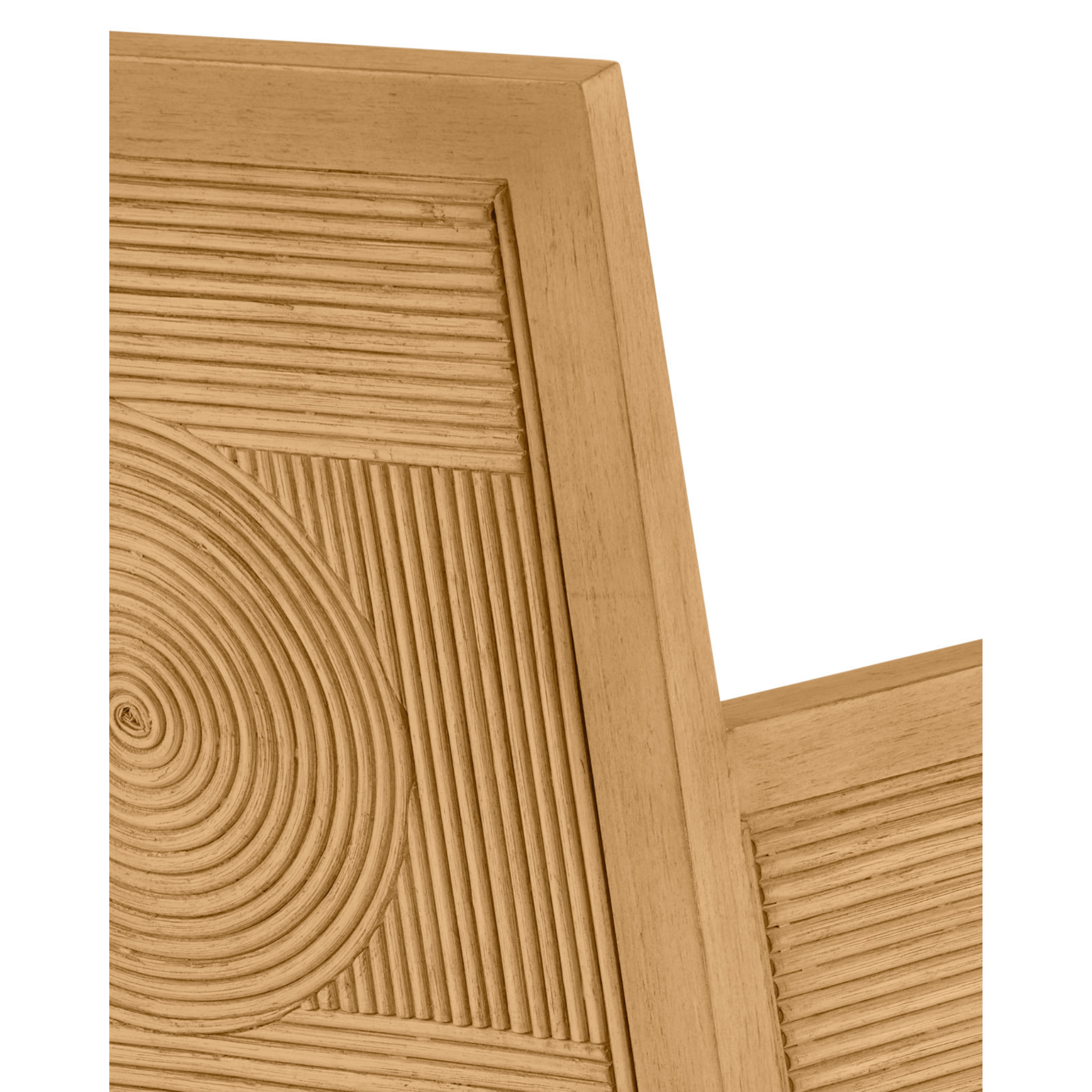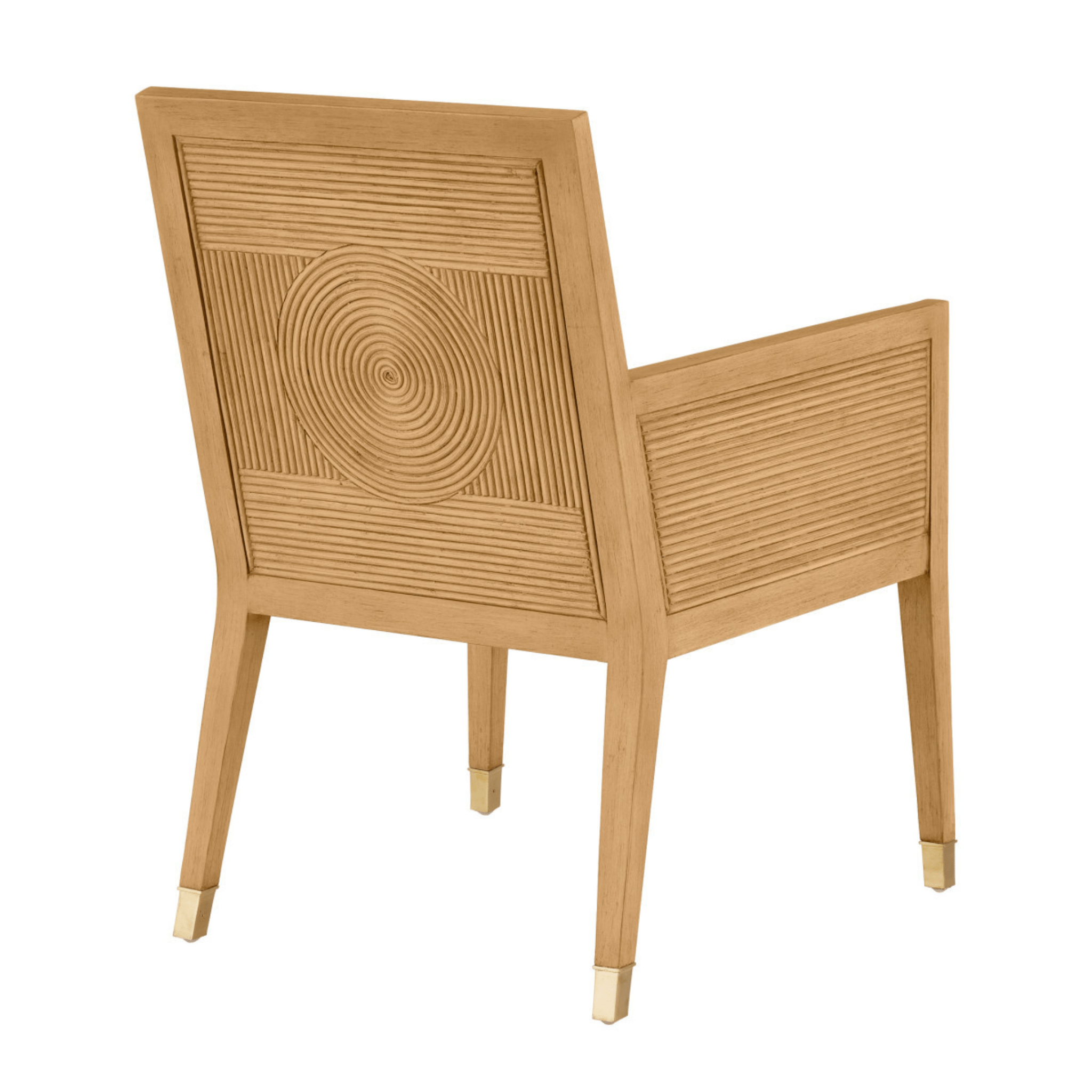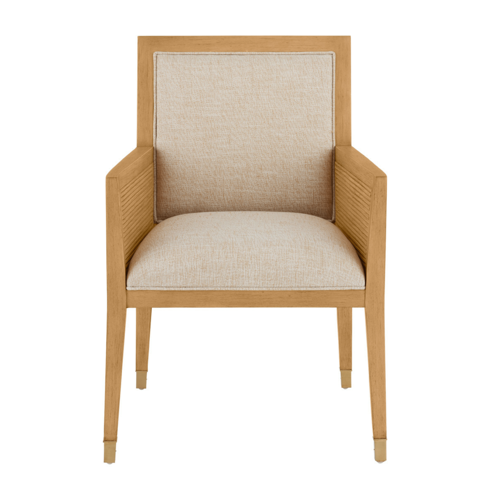 The Treasure Cay Sea Sand Armchair has a split rattan pattern on the back, and on the inside and outside of the arms, which is made by hand and applied to a solid mahogany frame. Once the natural material is in place, a vintage sea sand finish covers the back, frame and legs. The tan armchair is upholstered in Liller Malt Material. The chair has brass ferrules to add sophistication to the overall design.