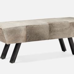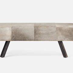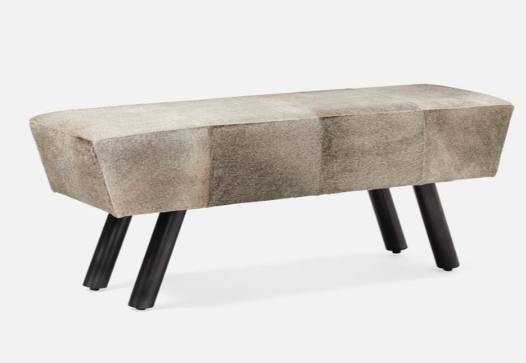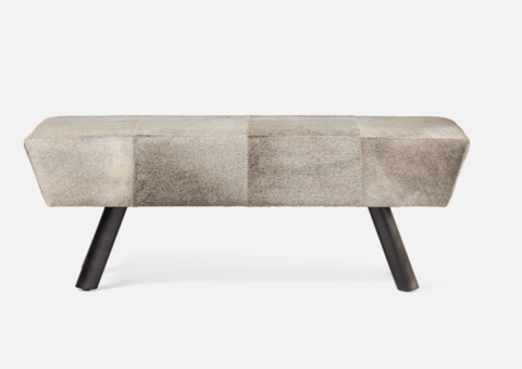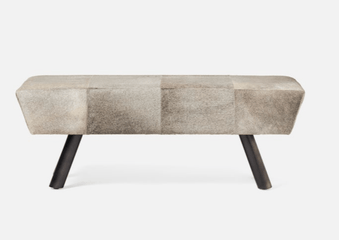 In a pommel horse style, our Trent bench is elevated in a patchwork of warm light gray hair-on-hide. The minimal cylindrical legs are crafted from steel in a bronze finish.