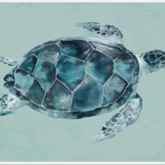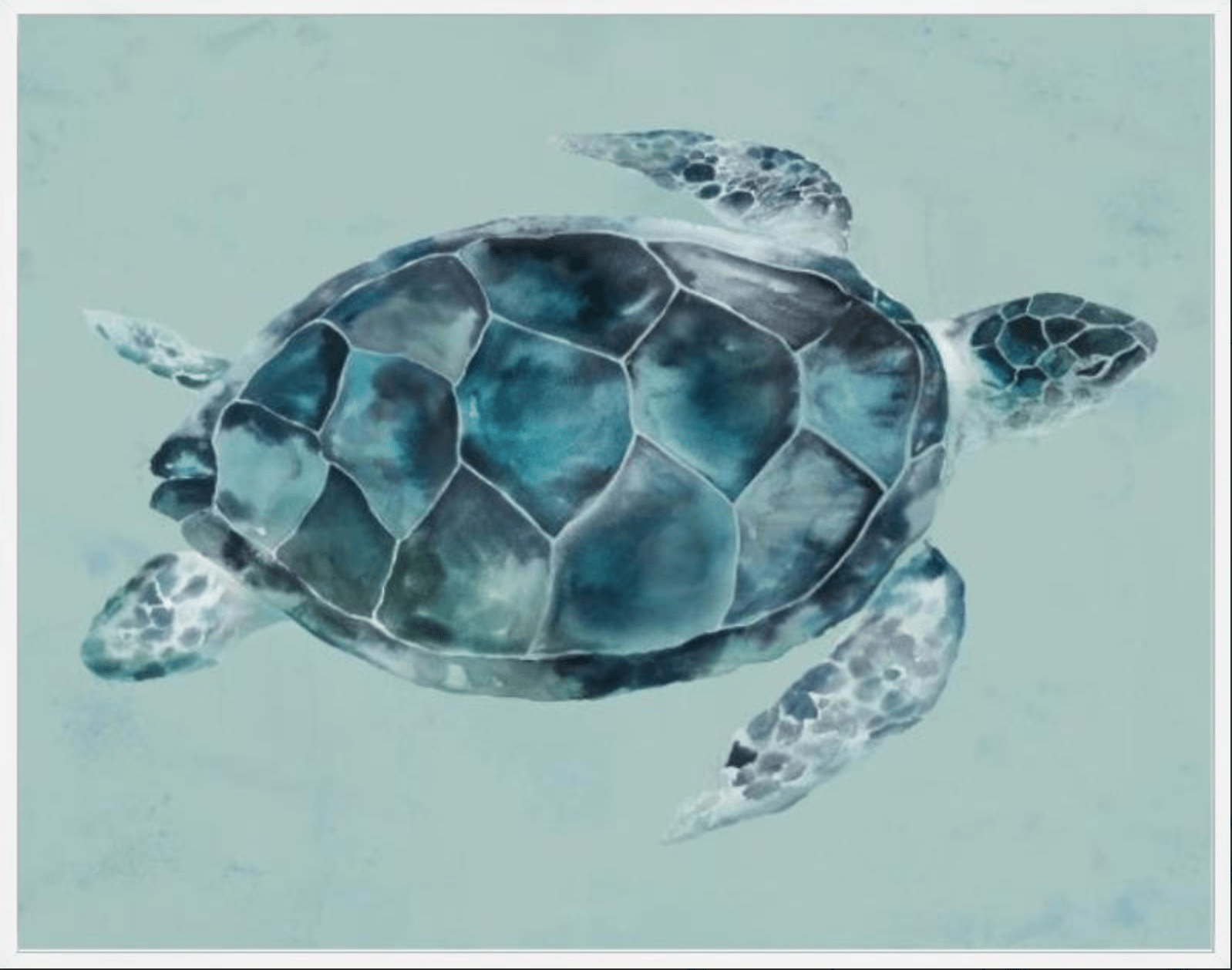 A framed image of a beautiful sea turtle in a brush gel giclée . A gorgeous rendition with teal, turquoise and spa blue turtle swimming in water makes a coastal statement like no other.