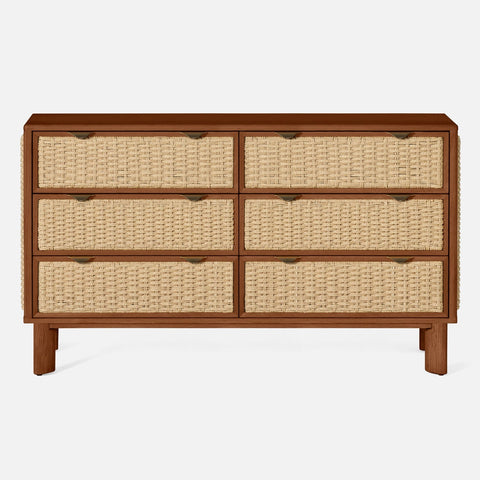 With clean lines, the modern Vienna Dresser celebrates neutral with an oak veneer and Danish cord panels. The drawers are finished with brass half-moon shaped pull handles.
