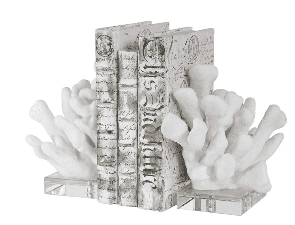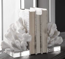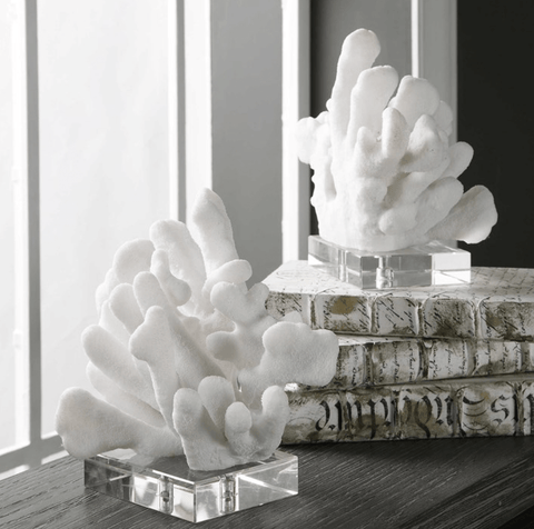 Set of two bookends- one in Small and one in Large. Both featuring textured faux white coral on crystal bases. Add a coastal touch to your bookshelf. Perfect accent piece to hold together coastal books.